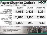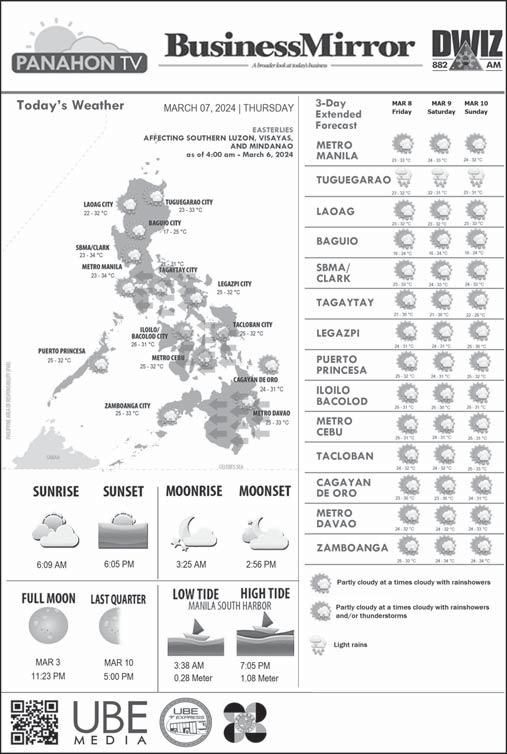 50 percent [target] by 2023, would be achieved. But give us until July to confirm,” Tangonan said. Data from the Annual Poverty Indicators Survey 2022 released by the Philippine Statistics Authority (PSA) showed that 65.3 percent of families nationwide used the internet in the last six months or between January and June 2022. There were 26.942 million families nationwide in 2022. More than half or 59.7 percent of these families used the internet for buying goods and services; 27.2 percent for bills payment; 18.2 percent for banking; 11.7 percent for other transactions; and 8.8 percent for selling. Among the regions, Calabarzon had the highest percentage of www.businessmirror.com.ph Thursday, March 7, 2024 Vol. 19 No. 144 P. nationwide | sections pages | 7 DAYS A WEEK ‘TOO SOON’ TO DECLARE VICTORY VS. INFLATION PESO EXCHANGE RATES US 56.0020 JAPAN 0.3733 UK 71.1617 HK 7.1577 SINGAPORE 41.7147 AUSTRALIA 36.4181 SAUDI ARABIA 14.9327 EU 60.8126 KOREA 0.0419 CHINA 7.7813 Source: BSP (March 6, 2024) BusinessMirror A broader look at today’s business ROTARY CLUB OF MANILA JOURNALISM AWARDS 2006 National Newspaper of the Year 2011 National Newspaper of the Year 2013 Business Newspaper of the Year 2017 Business Newspaper of the Year 2019 Business Newspaper of the Year 2021 Pro Patria Award PHILIPPINE STATISTICS AUTHORITY 2018 Data Champion EJAP JOURNALISM AWARDS BUSINESS NEWS SOURCE OF THE YEAR (2017, 2018, 2019, 2020) DEPARTMENT OF SCIENCE AND TECHNOLOGY 2018 BANTOG MEDIA AWARDS JCR KEEPS PHL CREDIT RATING ON GROWTH, DEBT-GDP RATIO See “Inflation,” A Continued on A HEAT IS ON: FARMERS BATTLE RISING INFLATION AND EL NIÑO As Philippine inflation rises amid the challenges posed by El Niño, farmers in Mabitac, Laguna, carry on with their crucial tasks despite the adversities. In the face of widespread water shortages induced by El Niño, the agricultural sector faces significant hurdles, with crop production damage being highest at this period. This impact extends beyond upland and rainfed areas to lowland irrigated areas like Mabitac. After meticulously tending to newly planted palay seedlings and applying fertilizers and pesticides, farmers now turn their attention to the essential task of irrigating the farm plots using the traditional “paiinumin” method. BERNARD TESTA Wider digital transactions base needed for PDP SOUTHEAST ASIAN LEADERS CALL FOR SOUTH CHINA SEA DISPUTES TO BE RESOLVED WITHOUT THREATS OR FORCE THE WORLD »A10 See “PDP,” A House panel okays RBH 7 in bid to fast-track Cha-cha See “Cha-cha,” A By Cai U. Ordinario @caiordinario