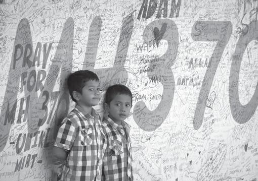 TWO Malaysian children stand in front of a message board adorned with well wishes for those involved with the missing Malaysia Airlines jetliner MH370, in Sepang, Malaysia, on March 16, 2014. AP/VINCENT THIAN