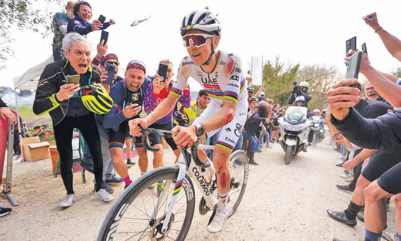 SIENA, Italy—Bruised and bloodied, Tadej Pogacar still managed to solo to victory on Saturday.