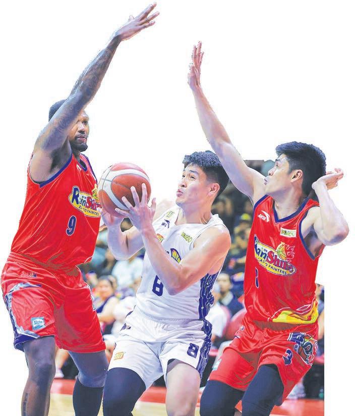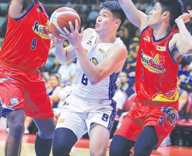CALVIN OFTANA tries to get out of a trap put up by Rain or Shine’s import Deon Thompson and Gian Mamuyac during the semifinal clash.