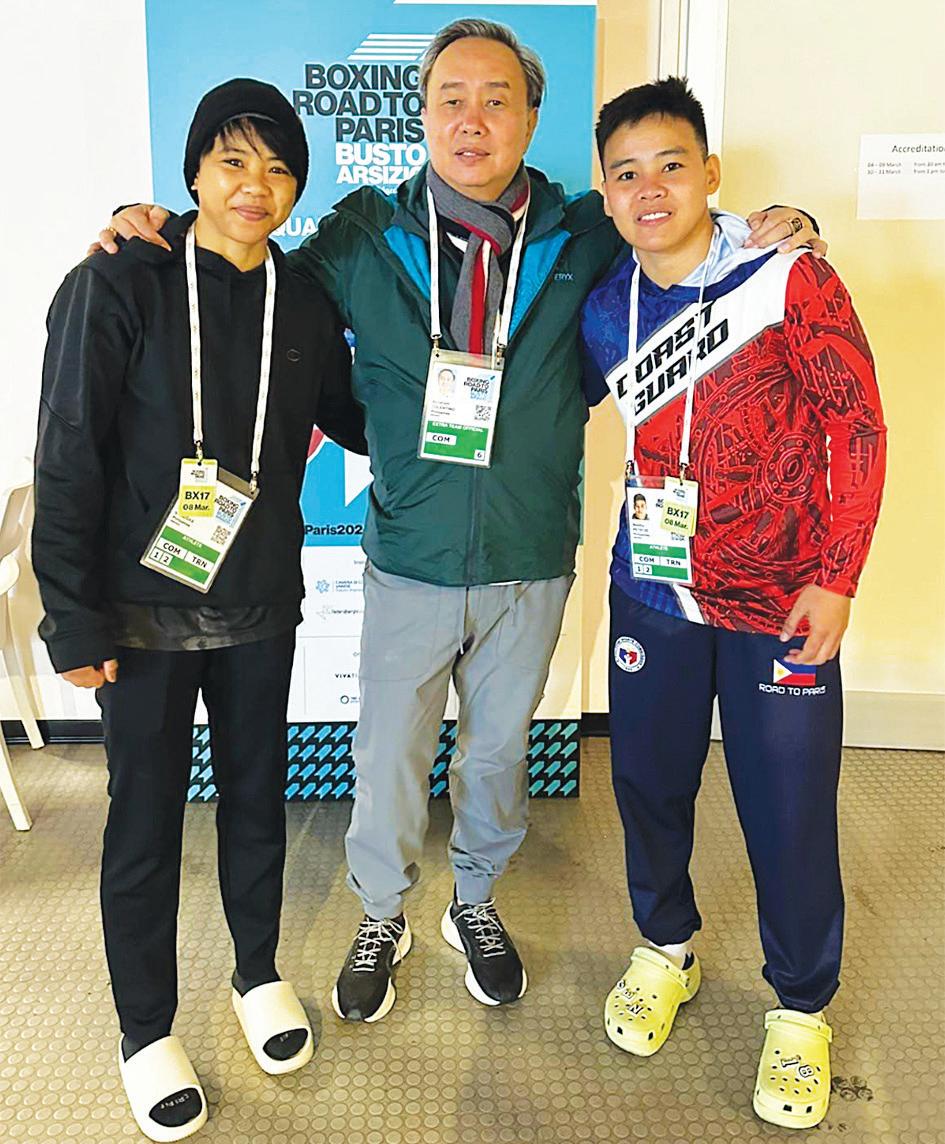 PARIS Olympics qualifiers Aira Villegas (left) and Nesthy Petecio (right) with Philippine Olympic Committee president Abraham “Bambol” Tolentino.