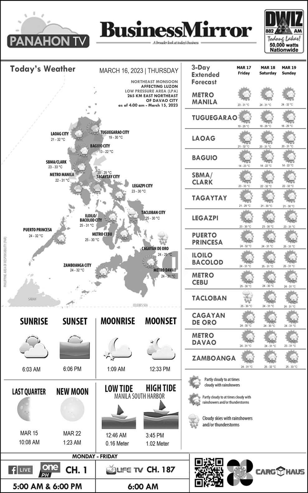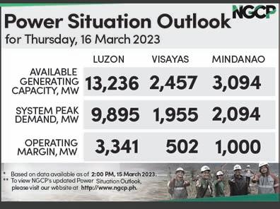 PESO EXCHANGE RATES US 55.0250 ■ JAPAN 0.4099 ■ UK 66.8939 ■ HK 7.0112 ■ SINGAPORE 40.9138 ■ AUSTRALIA 36.7567 ■ SAUDI ARABIA 14.6550 ■ EU 59.0638 ■ KOREA 0.0422 ■ CHINA 7.9984 Source: BSP (March 15, 2023) C A BusinessMirror A broader look at today’s business www.businessmirror.com.ph P. | | 7 DAYS A WEEK ■ Thursday, March 16, 2023 Vol. 18 No. 152 ROTARY CLUB OF MANILA JOURNALISM AWARDS 2006 National Newspaper of the Year 2011 National Newspaper of the Year 2013 Business Newspaper of the Year 2017 Business Newspaper of the Year 2019 Business Newspaper of the Year 2021 Pro Patria Award PHILIPPINE STATISTICS AUTHORITY 2018 Data Champion EJAP JOURNALISM AWARDS BUSINESS NEWS SOURCE OF THE YEAR (2017, 2018, 2019, 2020) DEPARTMENT OF SCIENCE AND TECHNOLOGY 2018 BANTOG MEDIA AWARDS