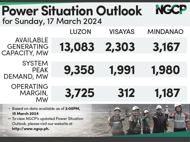 PESO EXCHANGE RATES n US 55.3950 n JAPAN 0.3736 n UK 70.6619 n HK 7.0817 n CHINA 7.6991 n SINGAPORE 41.4633 n AUSTRALIA 36.4554 n EU 60.3141 n KOREA 0.0419 n SAUDI ARABIA 14.7712 Source: BSP (March 15, 2024) Continued on A2 A broader look at today’s business EJAP JOURNALISM AWARDS BUSINESS NEWS SOURCE OF THE YEAR (2017, 2018, 2019, 2020, 2021) DEPARTMENT OF SCIENCE AND TECHNOLOGY 2018 BANTOG MEDIA AWARDS ROTARY CLUB OF MANILA JOURNALISM AWARDS 2006 National Newspaper of the Year 2011 National Newspaper of the Year 2013 Business Newspaper of the Year 2017 Business Newspaper of the Year 2019 Business Newspaper of the Year 2021 Pro Patria Award PHILIPPINE STATISTICS AUTHORITY 2018 Data Champion www.businessmirror.com.ph n Sunday, March 17, 2024 Vol. 19 No. 154 P25.00 nationwide | 2 sections 12 pages | 7 DAYS A WEEK ‘SAVE WATER, SAVE EARTH’ regular session of the 20th Congress on January 9 that following Apo Agua’s completion of the critical infrastructures needed, “the water delivered to the DCWD is safe and reliable”. Water sufficiency DUHAYLUNGSOD also reported significant improvement in the availability of water and pressure, especially in areas experiencing intermittent water supply since the start of the bulk water supply. The project involved the extraction of the surface water of the Panigan-Tamugan River situated inside the Talomo-Lipadas watershed in the northern part of the city. Shake Tuason, operations head of Apo Agua, said the company would like to see the consistency of the river water to supply the 300 million liters per day produc-