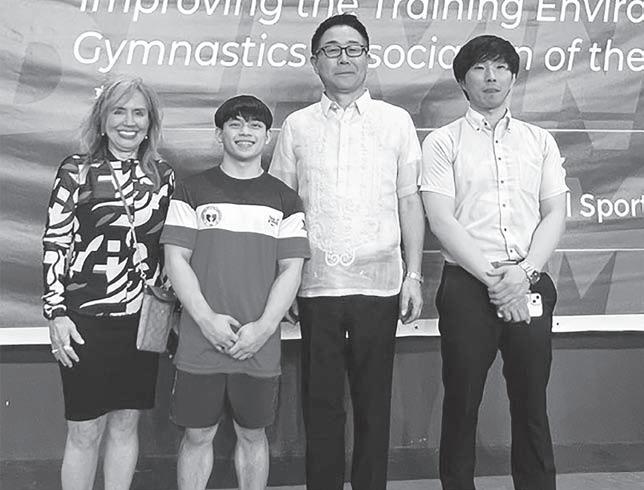 CARLOS “CALOY” YULO (second from left) with (from left) Gymnastics Association of the Philippines president Cynthia Carrion-Norton, Japanese Ambassador Koshikawa Kazuhiko and Japanese coach Munehiro Kugiyama.
