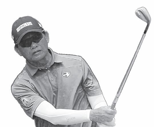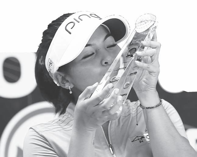 CHANELLE AVARICIO finds herself kissing the champion’s trophy despite setting a modest goal of finishing in second place. In men’s action, Frankie Miñoza finds it’s crowded at the top. PHOTOS BY NONIE REYES par-putt from 12 feet on the 18th to salvage an even par 70 for a 221 worth P105,000. Back in the final group, Ababa hung on to the lead despite a frontside 40 marred by a double bogey on No. 4. The two-day leader failed to check her skid and bogeyed four of the last five holes, missing forcing a playoff from just