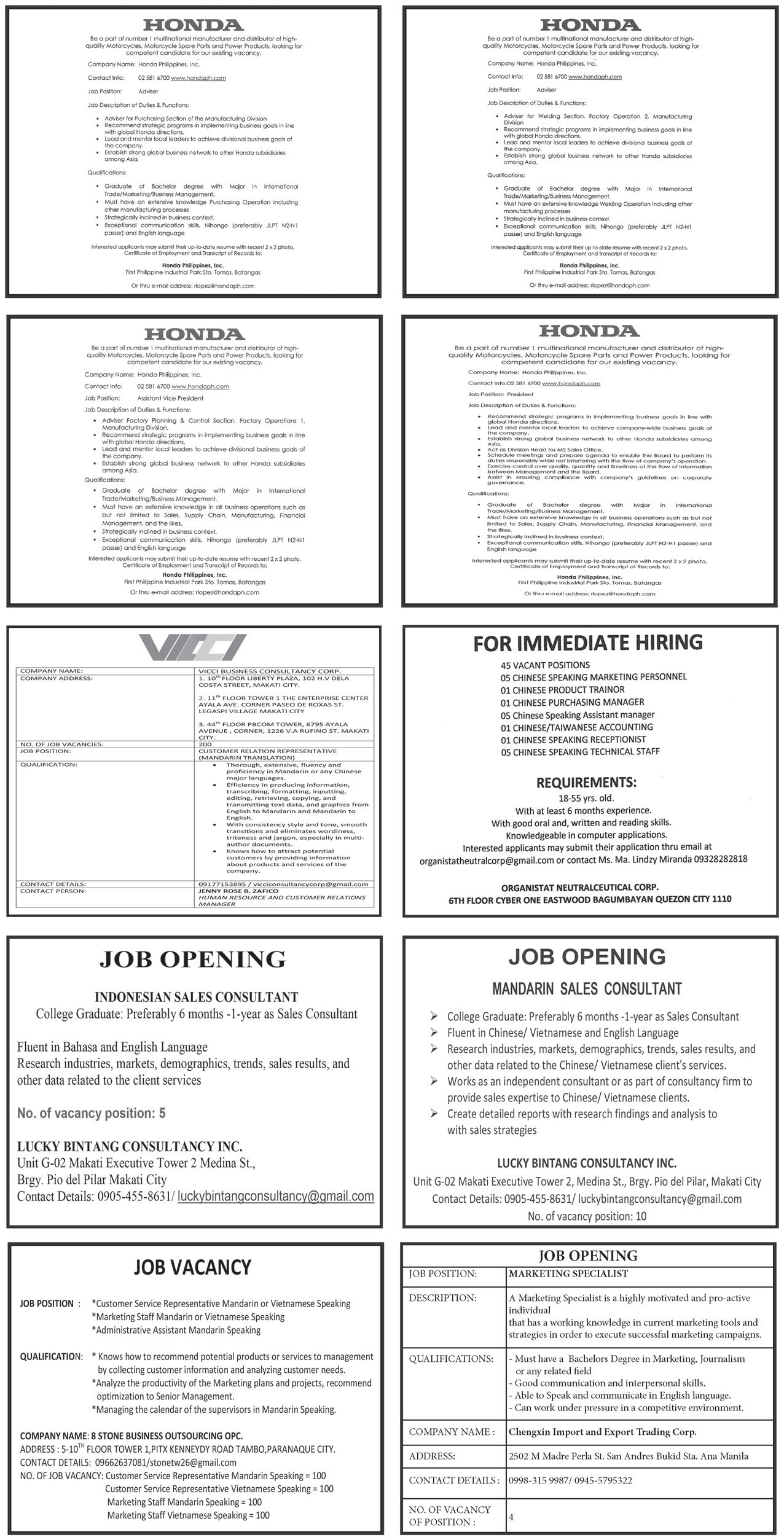 ESTABLISHMENT / ADDRESS No. NAME OF FOREIGN NATIONAL , POSITION AND BRIEF DESCRIPTION QUALIFICATION AND SALARY RANGE ESTABLISHMENT / ADDRESS No. NAME OF FOREIGN NATIONAL POSITION AND BRIEF DESCRIPTION QUALIFICATION AND SALARY RANGE ESTABLISHMENT / ADDRESS No. NAME OF FOREIGN NATIONAL , POSITION AND BRIEF DESCRIPTION QUALIFICATION AND SALARY RANGE 87. HU, YANHAO Chinese Speaking Admin Associate Brief Job Description: Assist/help customers, give customers information about product and services. Basic Qualification: With at least 6 months customer service experience/good in oral communication and written. Salary Range: Php 30,000 - Php 59,999 88. MELVIN LIEW YICK FEI Chinese Speaking Admin Associate Brief Job Description: Assist/help customers, give customers information about product and services Basic Qualification: With at least 6 months customer service experience/good in oral communication and written Salary Range: Php 30,000 - Php 59,999 89. TAN MENG HOI Chinese Speaking Admin Associate Brief Job Description: Assist/help customers, give customers information about product and services. Basic Qualification: With at least 6 months customer service experience/good in oral communication and written. Salary Range: Php 30,000 - Php 59,999 90. YUAN, XIANG Chinese Speaking Admin Associate Brief Job Description: Assist/help customers, give customers information about product and services. Basic Qualification: With at least 6 months customer service experience/good in oral communication and written. Salary Range: Php 30,000 - Php 59,999 91. ZHANG, BIAO Chinese Speaking Admin Associate Brief Job Description: Assist/help customers, give customers information about product and services Basic Qualification: With at least 6 months customer service experience/good in oral communication and written Salary Range: Php 30,000 - Php 59,999 92. BAO, XINGYUN Chinese Speaking Business Development Associate Brief Job Description: Assist/help customers, give customers information about product and services. Basic Qualification: With at least 6 months customer service experience/good in oral communication and written. Salary Range: Php 30,000 - Php 59,999 93. HE, QIQI Chinese Speaking Business Development Associate Brief Job Description: Assist/help customers, give customers information about product and services. Basic Qualification: With at least 6 months customer service experience/good in oral communication and written. Salary Range: Php 30,000 - Php 59,999 94. WANG, BING Chinese Speaking Business Development Associate Brief Job Description: Assist/help customers, give customers information about product and services. Basic Qualification: With at least 6 months customer service experience/good in oral communication and written. Salary Range: Php 30,000 - Php 59,999 95. DAM THI NGA Chinese Speaking Data Entry Clerk Brief Job Description: Assist/help customers, give customers information about product and services. Basic Qualification: With at least 6 months customer service experience/good in oral communication and written. Salary Range: Php 30,000 - Php 59,999 96. HUYNH GIA LANH Chinese Speaking Data Entry Clerk Brief Job Description: Assist/help customers, give customers information about product and services. Basic Qualification: With at least 6 months customer service experience/good in oral communication and written. Salary Range: Php 30,000 - Php 59,999 97. LU, CHUNDI Chinese Speaking Data Entry Clerk Brief Job Description: Assist/help customers, give customers information about product and services. Basic Qualification: With at least 6 months customer service experience/good in oral communication and written. Salary Range: Php 30,000 - Php 59,999 98. OUYANG, SHUNJIE Chinese Speaking Data Entry Clerk Brief Job Description: Assist/help customers, give customers information about product and services Basic Qualification: With at least 6 months customer service experience/good in oral communication and written Salary Range: Php 30,000 - Php 59,999 99. XU, QIDONG Chinese Speaking Data Entry Clerk Brief Job Description: Assist/help customers, give customers information about product and services. Basic Qualification: With at least 6 months customer service experience/good in oral communication and written. Salary Range: Php 30,000 - Php 59,999 100. DANG THI THANH Chinese Speaking Graphic Designer Brief Job Description: Assist/help customers, give customers information about product and services. Basic Qualification: With at least 6 months customer service experience/good in oral communication and written. Salary Range: Php 30,000 - Php 59,999 101. FENG, SHILIANG Chinese Speaking Graphic Designer Brief Job Description: Assist/help customers, give customers information about product and services Basic Qualification: With at least 6 months customer service experience/good in oral communication and written Salary Range: Php 30,000 - Php 59,999 102. MA, HAILONG Chinese Speaking Graphic Designer Brief Job Description: Assist/help customers, give customers information about product and services Basic Qualification: With at least 6 months customer service experience/good in oral communication and written Salary Range: Php 30,000 - Php 59,999 103. HUANG, MEILI Chinese Speaking Program Designer Brief Job Description: Assist/help customers, give customers information about product and services Basic Qualification: With at least 6 months customer service experience/good in oral communication and written Salary Range: Php 30,000 - Php 59,999 EASYTECH SUPPORT INC. 9-11/f, 14/f Capella Bldg., Asean Drive Filinvest, Alabang, City Of Muntinlupa 104. KU WEI SHUNG Mandarin Speaking Customer Service Representative Brief Job Description: Recommends potential products or services to management by collecting information and analyzing customer needs Basic Qualification: Proficient in speaking, reading and writing in Mandarin Salary Range: Php 30,000 - Php 59,999 105. NG BOON FUI Mandarin Speaking Customer Service Representative Br