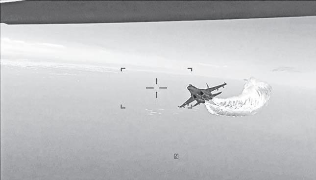 THIS photo taken from video released on Thursday, March 16, 2023, shows a Russian Su-27 approaching the back of the MQ-9 drone and beginning to release fuel as it passes, over the Black Sea, the Pentagon said. The Pentagon has released footage of what it says is a Russian aircraft conducting an unsafe intercept of a US Air Force surveillance drone in international airspace over the Black Sea. US DEPARTMENT OF DEFENSE VIA AP