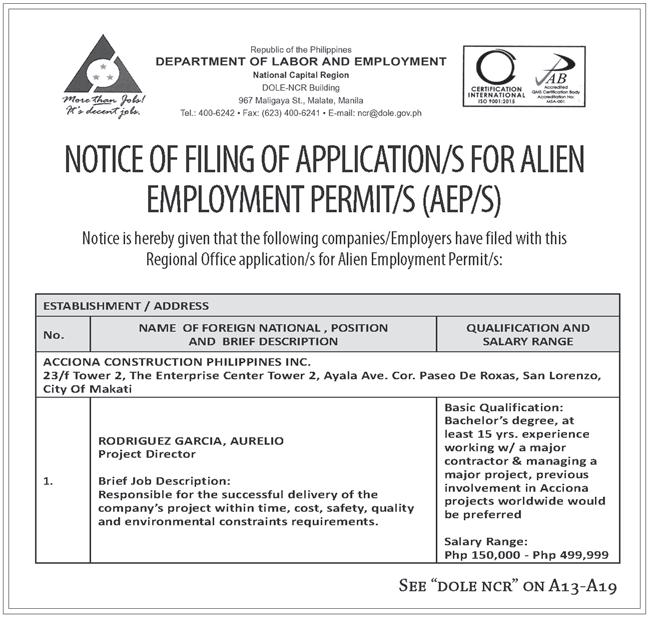 Any person in the Philippines who is competent, able and willing to perform the services for which the foreign national is desired may file an objection at DOLE National Capital Region located at DOLE-NCR Building, 967 Maligaya St., Malate Manila, within 30 days after this publication.