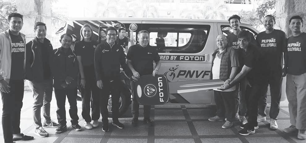 PHILIPPINE National Volleyball Federation (PNVF) president Ramon “Tats” Suzara is presented the symbolic key to the PNVF Foton Team Van by Foton General Manager Levy Santos (fifth and sixth from left) during a turnover ceremony on Saturday in a restaurant in Pasay City. With them are (from left) national player Jayvee Sumagaysay, PNVF secretary-general Donaldo Caringal and chairman Dr. Arnel Hajan, national player Mylene Paat, PNVF national team chairman Tonyboy Liao, Filipino-American Steven Rotter, Brazilian coach Sergio Veloso and Filipino-American players Cyrus De Guzman and Michael Raymond Vicente. ROY DOMINGO