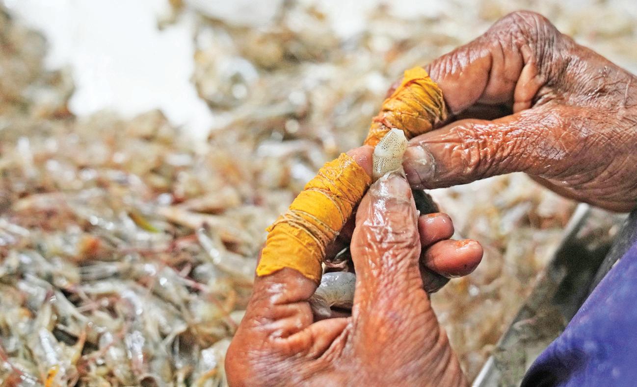 A WORKER peels shrimp in a tin-roofed processing shed in the hamlet of Tallarevu, in Kakinada district, in the Indian state of Andhra Pradesh on February 11, 2024. Dr. Sushmitha Meda, a dermatologist at a nearby government hospital in the city of Kakinada, said she treats four to five shrimp peelers every day for frostbite and infection. It’s a preventable problem, she said. Cotton gloves covered with latex gloves can protect peelers’ hands, but few can afford a $3 box of gloves. AP/MAHESH KUMAR A.