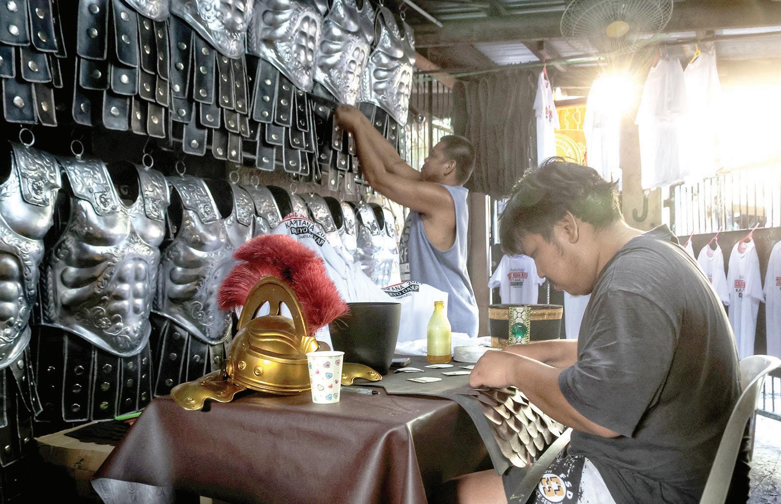 in Barangay Sto. Niño, Cainta, Rizal. Nearby, Johnrain Bendaña Cruz prepares his Judaean armor as performers make last-minute refinements in anticipation of their Holy Week presentation. BERNARD TESTA