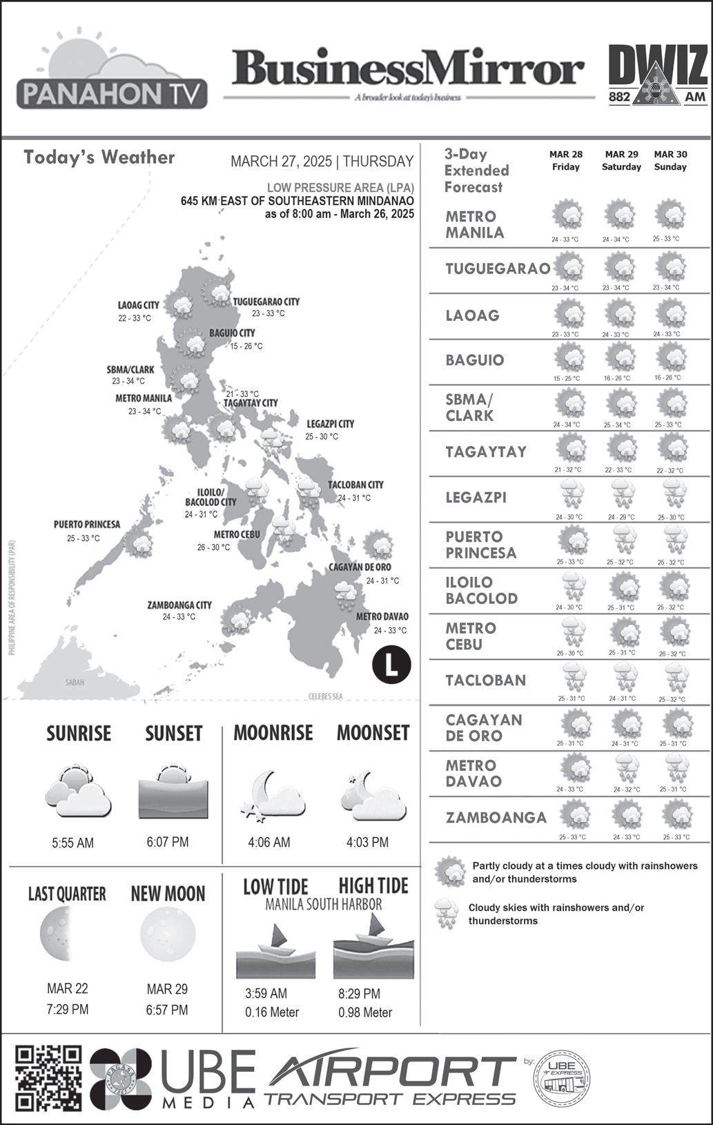 “We’re not yet at that level where it looks dangerous that we are making rates too low or even negative. But our sense is, we’re getting close to the neutral rate for the BSP,” Neri said. The current 5.75-percent key policy rate, which the BSP maintained in its rate-setting meeting on February 13 due to global uncertainties, is “still slightly above the average policy rate of the BSP,” Neri said. BSP Governor Eli M. Remolona Jr. has said the BSP is still on an easing cycle and there is a “good chance” it will cut rates by 25 basis points in its meeting on April 10. (See: https://businessmirror.com.ph/2025/03/26/ bsp-says-intervening-less-inpeso-sees-cut-in-rates/).