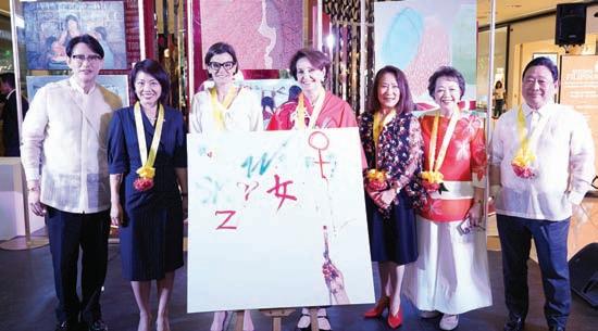 (From left) SM Supermalls’ President Steven Tan, Singapore Ambassador Constance See, British Ambassador Laure Beaufils, US Ambassador MaryKay Carlson, SM Hotels and Conventions Corporation President Elizabeth Sy, ZCME President Jeannie Abaya, and BDO Private Bank President Albert Yeo signed the ‘Sining Filipina’ canvas to symbolize their support for Filipina artistry and officially mark the opening of the exhibition