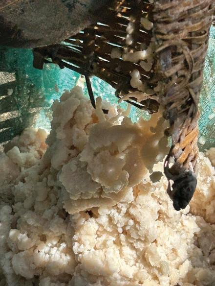 PRECIOUS DROP: Brine drips into an earthenware jar after leaching from