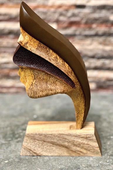 The Sining Filipina trophy, made from mango and narra wood, is a creative representation of everything that it means to be a woman. A play on contrasts presents a piece that is strong yet soft. The trophy was crafted from wood, artfully shaped to form smooth, flowing curves and brushstrokes. The female silhouette was also reimagined to look like a cornucopia— symbolizing abundance and the overflowing creativity in the arts.