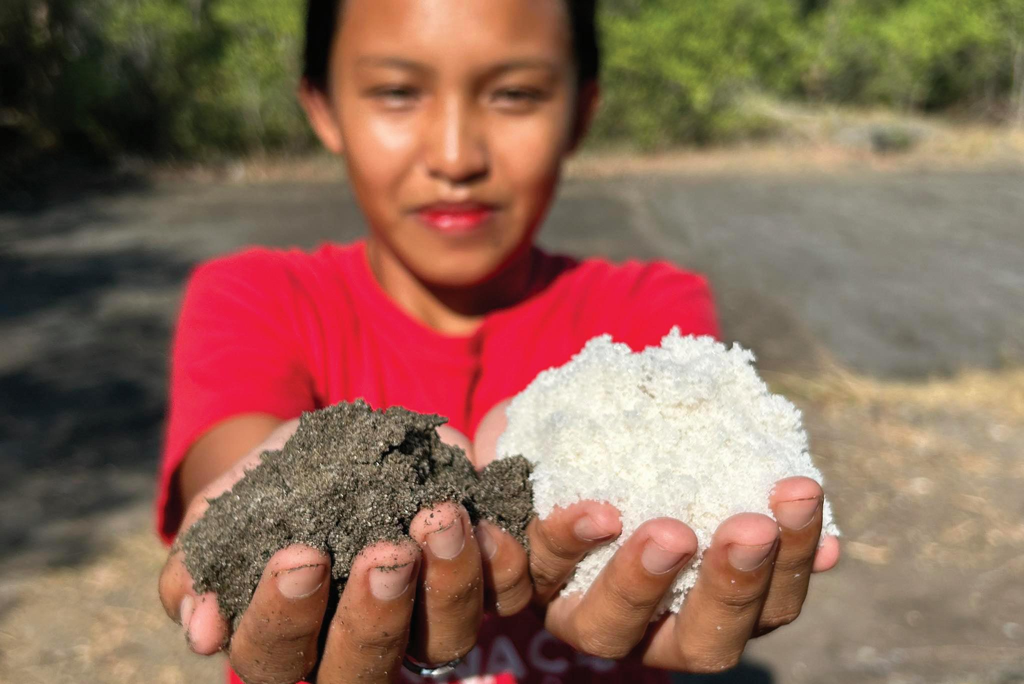 SALT FROM THE EARTH: Sandy, a third-generation saltmaker at Panayunan in Botolan, Zambales, holds fistfuls of salt and earth, the product and raw material, respectively, in the processing of asin sa buy-o, Zambales’s artisanal salt. HENRY EMPEÑO