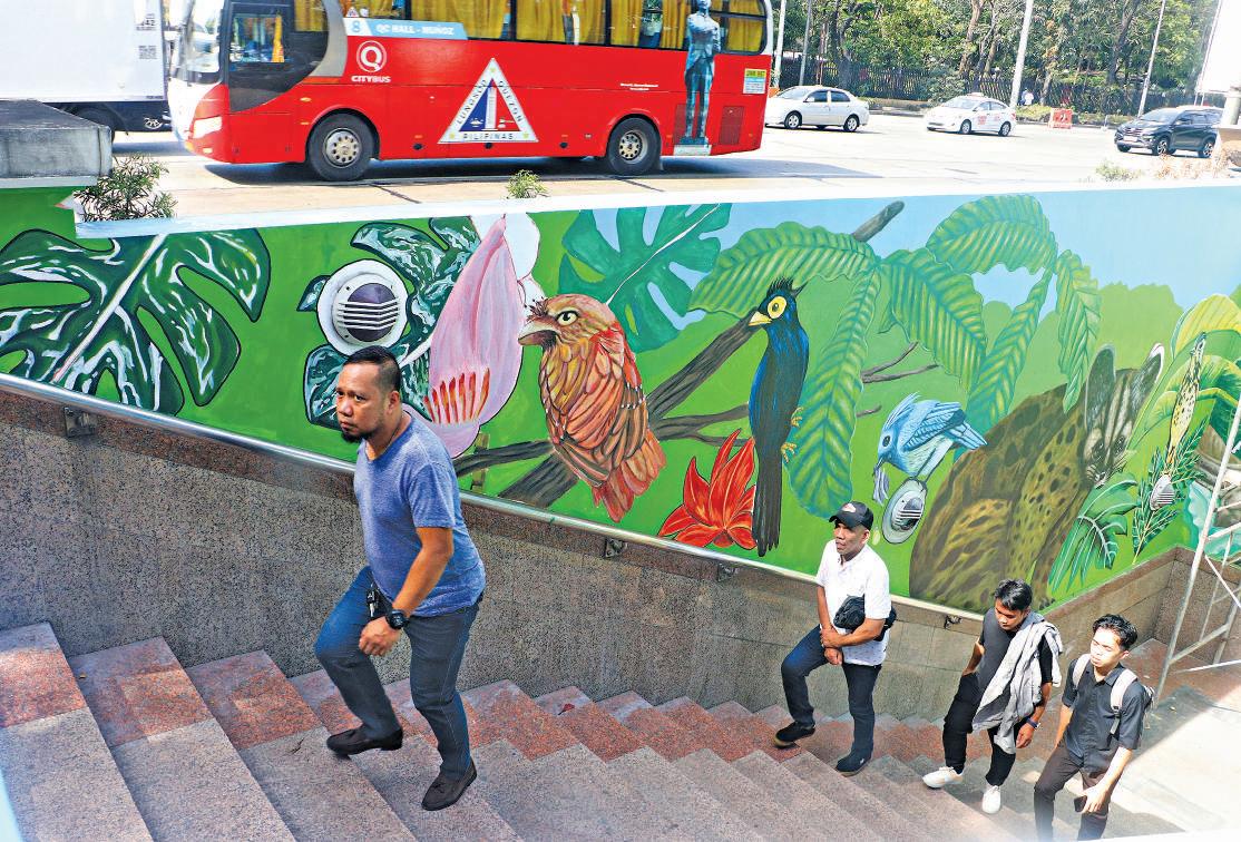 art FOr bIODIVErSIty Pedestrians walk past a mural at the Quezon memorial circle underpass in Quezon city on thursday, march 30, 2023. the local government partnered with Sentro