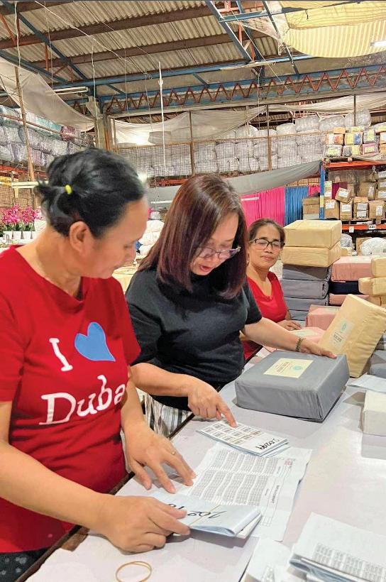 The Ultima Line of linen on display at SM Store. Gigi Uy-Cirera, supplier of Ultima Linen Eva Marie also produces baskets. A pouch by Eva Marie Benny Sarmiento (center), who supplies the Margaret Muir line of beddings, checks her stocks. One of the many designs of the Margaret Muir line of beddings. Eva Marie Yu puts on the finishing touches on one of the bags.