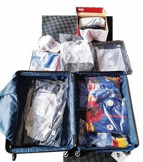 The kits included track suits, tech shirts, socks, backpacks, caps, shoes, towels, string bags, shorts and luggage.
