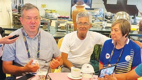 PHILIPPINE Sports Commission chairman Richard Bachmann (left) and commissioners Olivia “Bong” Coo (right) and Fritz Gaston answer questions from Filipino reporters. ROY DOMINGO