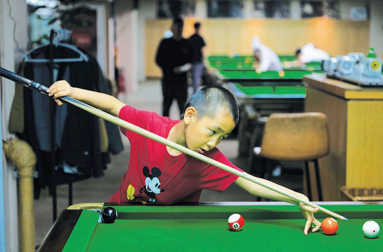 ZHAO XINTONG is now an inspiration in China, including eight-year-old Li Zelei, who practices on a pool table at the Beijing Xinrui Billiard Academy in Beijing. AP