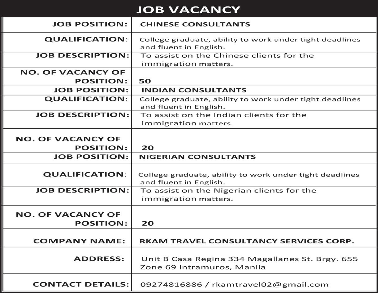 Job Description: Reporting findings and obtaining approval from senior management when required. Basic Qualification: At least college graduate, can speak, write and type in Mandarin and Vietnamese languages. Salary Range: Php 30,000 - Php 59,999