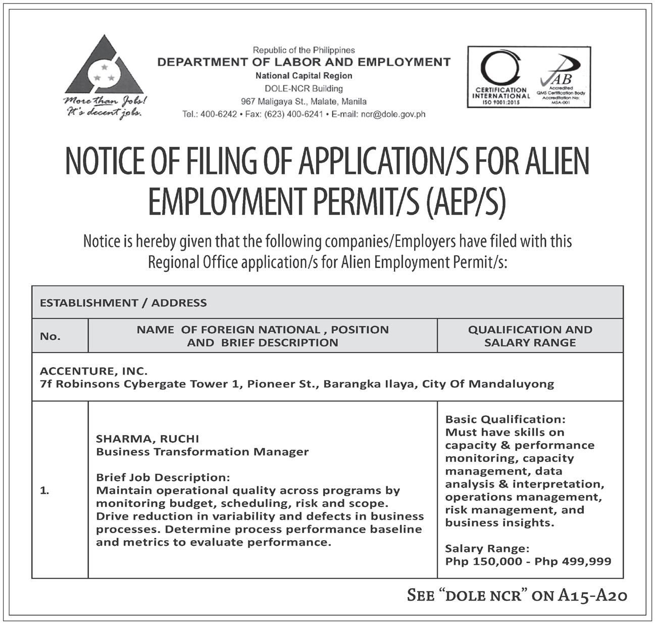 ESTABLISHMENT / ADDRESS No. NAME OF FOREIGN NATIONAL , POSITION AND BRIEF DESCRIPTION QUALIFICATION AND SALARY RANGE ESTABLISHMENT / ADDRESS No. NAME OF FOREIGN NATIONAL POSITION AND BRIEF DESCRIPTION QUALIFICATION AND SALARY RANGE ESTABLISHMENT / ADDRESS No. NAME OF FOREIGN NATIONAL , POSITION AND BRIEF DESCRIPTION QUALIFICATION AND SALARY RANGE 213. TRAN, THI TRUC LINH Vietnamese Customer Service Brief Job Description: Customer support and data base services. Basic Qualification: Knowledgeable in computer applications with good verbal and written communication skills. Salary Range: Php 30,000 - Php 59,999 214. VI VAN TINH Vietnamese Customer Service Brief Job Description: Customer support and data base services. Basic Qualification: Knowledgeable in computer applications with good verbal and written communication skills. Salary Range: Php 30,000 - Php 59,999 215. VU, THI THANH HUYEN Vietnamese Customer Service Brief Job Description: Customer support and data base services. Basic Qualification: Knowledgeable in computer applications with good verbal and written communication skills. Salary Range: Php 30,000 - Php 59,999 OCEAN MIGHT SUPPORT MANAGEMENT INC. 33/f Tower 6789, Ayala Ave., Bel-air, City Of Makati 32/f Tower 6789, Ayala Ave., Bel-air, City Of Makati 216. ANDRO Customer Service Representative Brief Job Description: Responsible for handling questions, comments, and complaints regarding a particular business. Their ultimate goal is to provide positive customer experiences by enhancing relationships between them. Basic Qualification: 18-55 y/o, with at least 6 months of work experience, and with good verbal and written communication skills. Salary Range: Php 30,000 - Php 59,999 217. BUABAN, KRONGTHONG Customer Service Representative Brief Job Description: Responsible for handling questions, comments and complaints regarding a particular business. Their ultimate goal is to provide positive customer experiences by enhancing relationships between them. Basic Qualification: 18-55 y/o, with at least 6 months of work experience, and with good verbal and written communication skills.