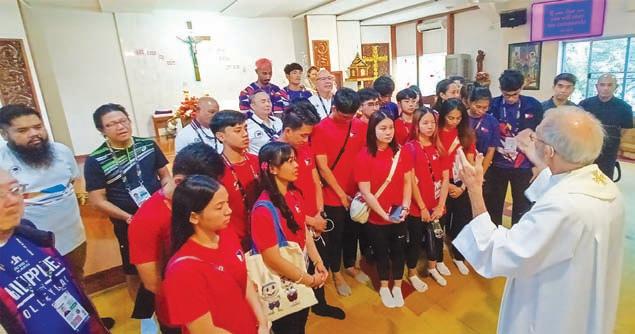 Members of Team Philippines hear Holy Mass at the St. Joseph Catholic Church in Phnom Penh on Sunday morning. Seen being blessed by the Officiating Priest are Philippine Olympic Committee President Rep. Abraham “Bambol” Tolentino and Deputy Secretary-General Carl Sambrano, Chef de Mission Chito Loyzaga, Philippine National Volleyball Federation President Ramon “Tats” Suzara and board member Tonyboy Liao, Ternate Mayor Lamberto Bambao and members of the taekwondo team.