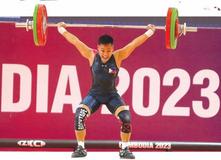 Tokyo Olympian Elreen Ando breaks three Southeast Asian Games records on her way to winning gold in the women’s 59 kgs class of weightlifting on Sunday afternoon in Phnom Penh. She resets the games marks in snatch (98 kgs), clean and jerk (118 kgs) and total lift (216 kgs) for the country’s first gold medal in the sport. ROY DOMINGO