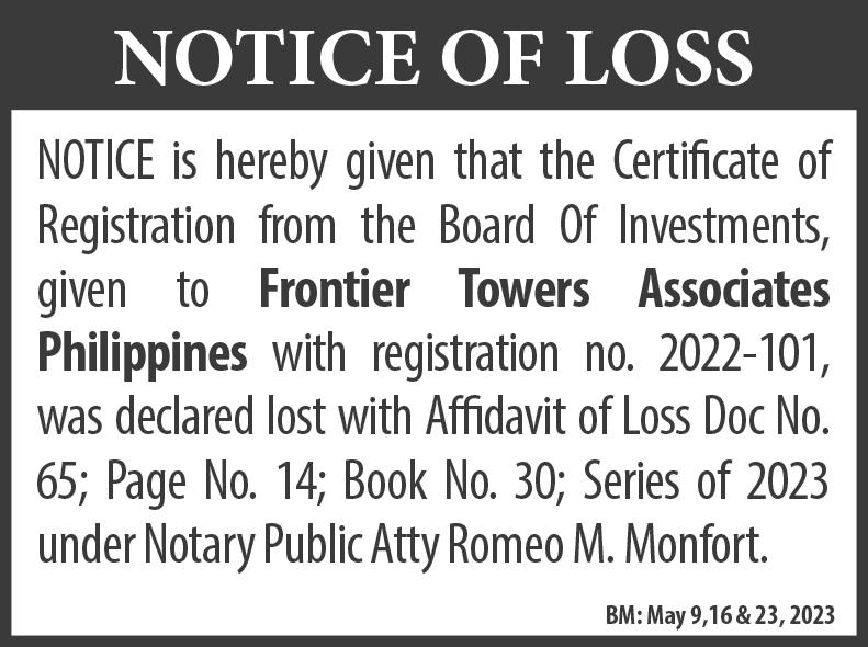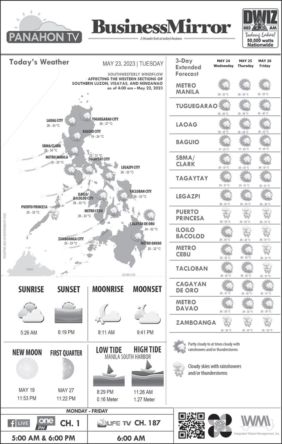 PESO EXCHANGE RATES n US 55.7080 n JAPAN 0.4037 n UK 69.3732 n HK 7.1267 n CHINA 7.9424 n SINGAPORE 41.4155 n AUSTRALIA 37.0235 n EU 60.2203 n KOREA 0.0421 n SAUDI ARABIA 14.8559 Source BSP (May 22, 2023) House okays bill for 30-yr national infra program See “House,” A2 w P25.00 nationwide | 2 sections 44 pages | n Tuesday, May 23, 2023 Vol. 18 No. 218