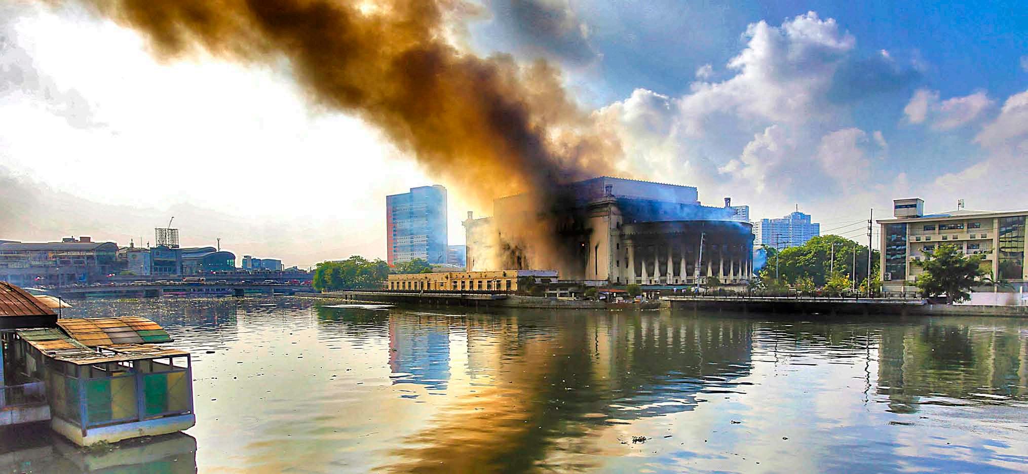 CULTURAL TREASURE Billowing smoke reflected on the Pasig River marks the loss of a beloved landmark as the historic Manila Central Post Office, a neoclassical architectural masterpiece designed by Filipino architects Juan M. Arellano and Tomás Mapúa in 1926, was completely destroyed by a fire that broke out late Sunday, May 21, 2023. The iconic building, which served as Manila’s main postal office and housed the Philippine Postal Corporation, held a significant place in the city’s heritage. Story in Nation, A3 NONIE REYES