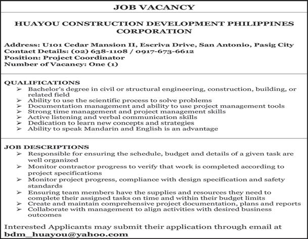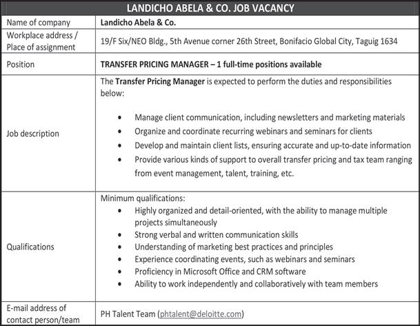 ESTABLISHMENT / ADDRESS No. NAME OF FOREIGN NATIONAL , POSITION AND BRIEF DESCRIPTION QUALIFICATION AND SALARY RANGE ESTABLISHMENT / ADDRESS No. NAME OF FOREIGN NATIONAL POSITION AND BRIEF DESCRIPTION QUALIFICATION AND SALARY RANGE ESTABLISHMENT / ADDRESS No. NAME OF FOREIGN NATIONAL , POSITION AND BRIEF DESCRIPTION QUALIFICATION AND SALARY RANGE BusinessMirror A6 www.businessmirror.com.ph A14 Saturday, May 27, 2023 56. WANG, JIEYI Finance Manager Brief Job Description: Responsible for the financial health of the organization. Basic Qualification: Graduate of any bachelor degrees. Salary Range: Php 30,000 - Php 59,999 57. DONG, BO Project Manager Brief Job Description: Manage sub-contractors by location, evaluating and selecting sub-contractors, and monitoring controlling process. Basic Qualification: Fluent in Mandarin & English language both verbal and written. Salary Range: Php 30,000 - Php 59,999 CHROMELAB TECHNOLOGIES INC. 25/f Techzone Bldg., 213 Sen. Gil Puyat Ave., San Antonio, City Of Makati 58. CHUA TIONG LEONG Bi-lingual Speaking Customer Service Officer Brief Job Description: Resolves product or service by clarifying the customers complaint. Basic Qualification: Fluent and proficient in writing and speaking at least 2 of the ff. languages: English, Mandarin, Cantonese, Thai, Bahasa Malaysia, Bahasa Indonesia, Korean, Spanish and Portuguese. Salary Range: Php 30,000 - Php 59,999 COLAS RAIL PHILIPPINES, INC. Unit 708 7/f Tower One & Exchange Plaza, Ayala Ave., Bel-air, City Of Makati 59. MONTEIRO MENA, PAULO ALEXANDRE Project Manager Brief Job Description: Determine and define the scope and objectives of the project. Forecast resources need to achieve objectives and manage resources effectively and efficiently. Prepare a budget based on the scope of work and resource requirements. Basic Qualification: Master’s degree holder. With 5 years of experience in railway project management. Salary Range: Php 150,000 - Php 499,999 DAEHAN Y.B. CONSULTANCY CORPORATION 1680 12/f Ramon Magsaysay Center, Roxas Blvd., Barangay 699, Malate, City Of Manila 60. YANG, HANJUN Business Consultant Brief Job Description: Offers consultation and expertise to help Korean client open business. Basic Qualification: Proficient in speaking, reading, and writing Korean and English. Salary Range: Php 30,000 - Php 59,999 EASY GO TRAVEL AND TOURS INC. G/f King’s Court 2 Bldg., 2129 Chino Roces Ave., Pio Del Pilar, City Of Makati 61. LUO, QIANG Marketing Consultant Brief Job Description: Conduct marketing research. Prepare detailed proposals and marketing plans. Study company profile. Advice on branding and marketing issues. Basic Qualification: Excellent communication skills, specifically in English and Chinese-Mandarin languages. Salary Range: Php 30,000 - Php 59,999 62. ZHANG, CHUNHONG Marketing Consultant Brief Job Description: Conduct marketing research. Prepare detailed proposals and marketing plans. Study company profile. Advice on branding and marketing issues. Basic Qualification: College graduate. Excellent communication skills, specifically in English and Chinese-Mandarin languages. Salary Range: Php 30,000 - Php 59,999 EG HEALTHCARE, INC. 14/f Ramon Magsaysay Center, 1680 Roxas Boulevard,076, Barangay 699, Malate, City Of Manila 63. SHIH, PO-YU Product Manager Brief Job Description: Responsible for identifying market opportunities, conduct market research projects and lead product launch activities and projects. Basic Qualification: Economics degree holder. Minimum five (5) years of experience as product manager. Salary Range: Php 90,000 - Php 149,999 ELEVATE PHILIPPINES INC. 27f Fort Legend Tower, 3rd Avenue Corner 31st Street Bonifacio Global City, Fort Bonifacio, City Of Taguig 64. MICHAEL STEVEN BUDIANTO Bilingual Analyst - Bahasa Speaking Brief Job Description: Partnering with the client’s business and control partners in establishing the regulatory controls, governance framework and methodology to manage the risk of the business. Basic Qualification: Fluent in Bahasa, excellent English communication skills. College graduate. Salary Range: Php 60,000 - Php 89,999 FIBERHOME PHILS., INC. U-19d 19/f Rufino Pacific Tower, 6784 Ayala Ave. Cor. V.a. Rufino St., San Lorenzo, City Of Makati 65. YU, JIAWEN Account Manager Brief Job Description: The account manager will be a strategist and a leader able to steer the company to the most profitable direction while also implementing its vision, mission and long term goals. Basic Qualification: Proven experience as account manager, excellent communication, interpersonal and presentation skills. Salary Range: Php 30,000 - Php 59,999 FUWEALTH SERVICES INC. Lower Penthouse Techzone Building, 213 Sen Gil Puyat Ave., San Antonio, City Of Makati 18/f Techzone Bldg., 213 Sen. Gil Puyat Ave., San Antonio, City Of Makati 66. CHOONG PEI TING Mandarin Speaking Customer Service Brief Job Description: Attracts potential customer by answering products and services questions. Basic Qualification: Can speak Mandarin. Salary Range: Php 30,000 - Php 59,999 67. HUANG, HAOTIAN Mandarin Speaking Customer Service Brief Job Description: Attracts potential customers by answering product and service questions; and suggesting information about other products and services. Basic Qualification: Can speak Mandarin. Salary Range: Php 30,000 - Php 59,999 68. LI, ZHICHENG Mandarin Speaking Customer Service Brief Job Description: Attracts potential customers by answering product and service questions; and suggesting information about other products and services. Basic Qualification: Can speak Mandarin. Salary Range: Php 30,000 - Php 59,999 69. ONG WAI KIT Mandarin Speaking Customer Service Brief Job Description: Attracts potential customers by answering product and service questions; and suggesting information about other products and services. Basic Qualification: Can speak Mandarin. Salary Range: Php 30,000 - Php 59,999 70. ZHOU, KANGTING Mandarin Speaking Customer Service Brief Job 