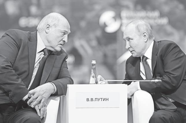 IN this photo released by Roscongress Foundation, Russian President Vladimir Putin, right, and Belarusian President Alexander Lukashenko talk to each other during the plenary session of the Eurasian Economic Forum in Moscow, Russia, Wednesday, May 24, 2023. AP