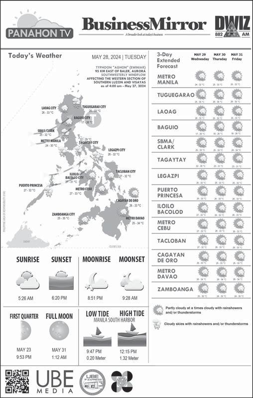 w P. nationwide | sections pages | Tuesday, May 28, 2024 Vol. 19 No. 224 See “Analysts,” A BusinessMirror ROTARY CLUB OF MANILA JOURNALISM AWARDS 2006 National Newspaper of the Year 2011 National Newspaper of the Year 2013 Business Newspaper of the Year 2017 Business Newspaper of the Year 2019 Business Newspaper of the Year 2021 Pro Patria Award 2018 Data Champion EJAP JOURNALISM AWARDS BUSINESS NEWS SOURCE OF THE YEAR 2017, 2018, 2019, 2020, 2021 DEPARTMENT OF SCIENCE AND TECHNOLOGY 2018 BANTOG MEDIA AWARDS THE DAY AFTER Banana trees strewn across the roadside in Barangay San Juan, Batangas City, tell the tale of Typhoon Aghon‘s fierce impact—its heavy rains and strong winds toppling these trees on Saturday night. The typhoon‘s landfall in Gumaca, Quezon, early Sunday further heightened the region’s challenges. As of Sunday, 11 barangays in Gumaca are grappling with the aftermath, prompting residents to seek refuge in evacuation centers. Story on the aftermath of storm Aghon in A3 Nation, “Aghon slightly changes track as it moves away.” ROY DOMINGO PESO EXCHANGE RATES US 58.1910 JAPAN 0.3708 UK 74.1528 HK 7.4494 CHINA 8.0336 SINGAPORE 43.1077 AUSTRALIA 38.5632 EU 63.1256 KOREA 0.0426 SAUDI ARABIA 15.5155 Source BSP (May 27, 2024) CHINA PREMIER REVIVES TRILATERAL COOPERATION WITH S. KOREA, JAPAN AMID SECURITY CONCERNS THE WORLD | A12