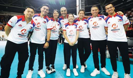 HEAD coach Jorge Edson De Brito (fourth from eft) with his coaching staff (from left) strength and condition ng coach Norman Montalvo, assistant coach Ed Ortega, team manager Hollie Reyes, physica therapist Grace Gomez team statistician Joyce Pa ad, assistant coach Ronwald Kris Dimaculangan and strength and condition ng coach Just n Aquino.
