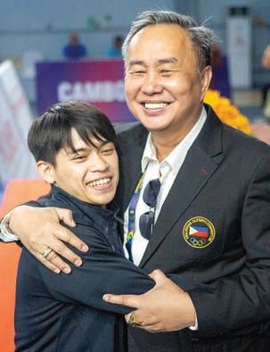 PHILIPPINE Olympic Committee Rep. Abraham “Bambol” Tolentino and Carlos Yulo hug during a successful campaign in the Cambodia Southeast Asian Games.
