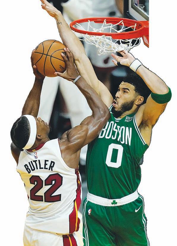 MIAMI’S Jimmy Butler goes up for a shot against Boston’s Jayson Tatum in Game 6.