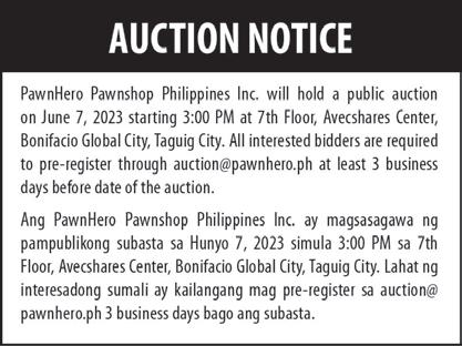 PESO EXCHANGE RATES n US 55.9860 n JAPAN 0.3988 n UK 69.1987 n HK 7.1518 n CHINA 7.9182 n SINGAPORE 41.3700 n AUSTRALIA 36.5980 n EU 59.9722 n KOREA 0.0423 n SAUDI ARABIA 14.9296 Source BSP (May 30, 2023) CLEANUP Workers of the Metropolitan Manila Development Authority (MMDA) conduct cleanup operations at Talayan creek along Araneta Avenue, Quezon City, on May 30, 2023. In anticipation of the rainy season, the MMDA has been actively clearing waterways across all 16 cities and municipalities of Metro Manila. Truckloads of waste have been removed from creeks and lateral drains, thanks to the efforts of the MMDA. The public is encouraged to support these efforts by refraining from littering and promptly reporting any clogged waterways to the MMDA. NONOY LACZA VAT drive missing ₧539B–DOF IMF AIDING PHL ON WAYS TO BOOST LOW VAT COLLECTION