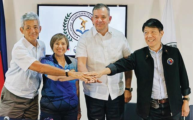 PHILIPPINE Sports Commission chairman Richard “Dickie” Bachmann (third from left) and commissioners (from left) Fritz Gaston, Olivia “Bong” Coo and Edward Hayco pose for unity.