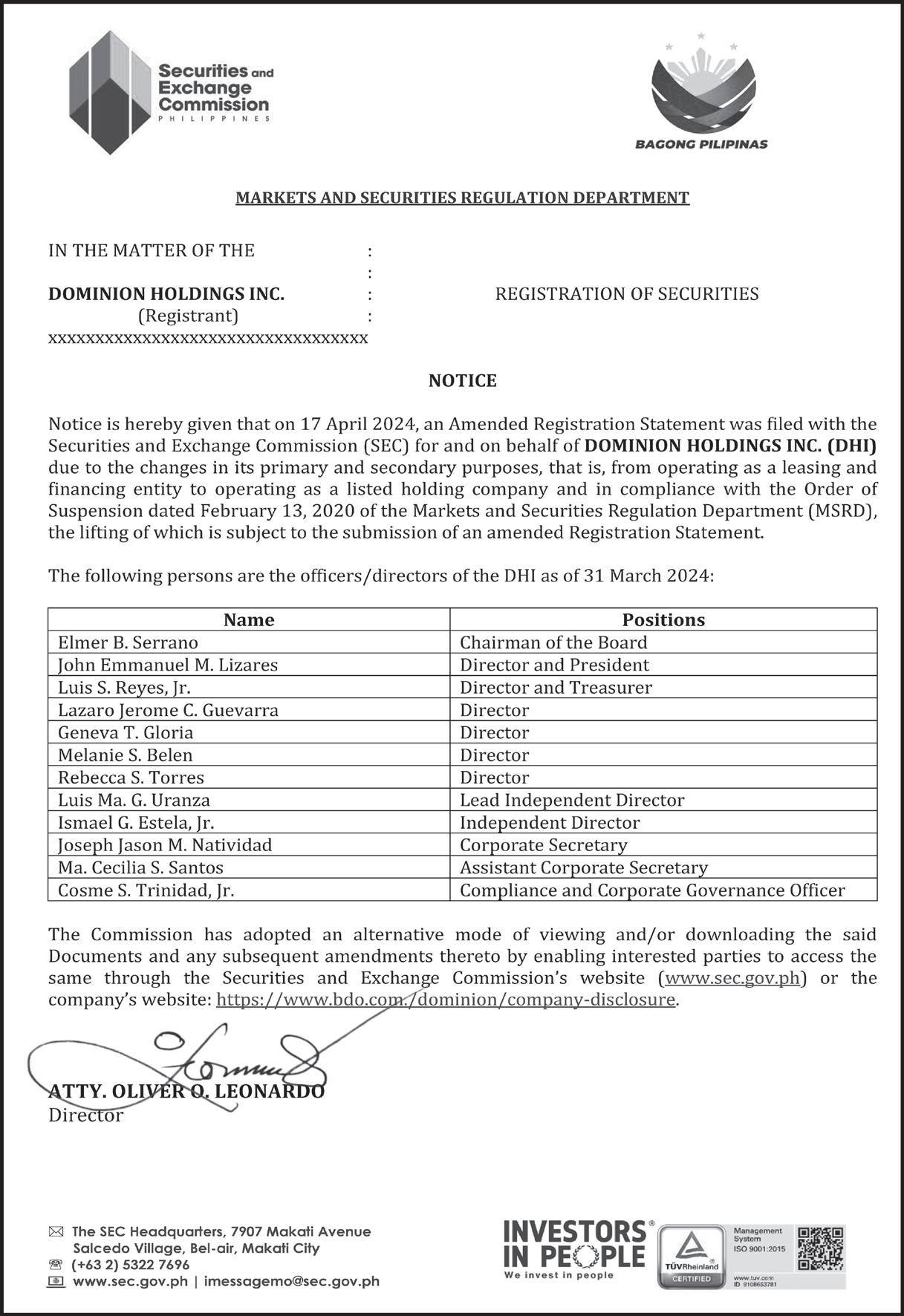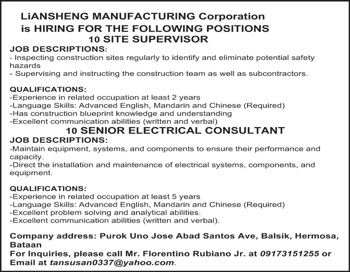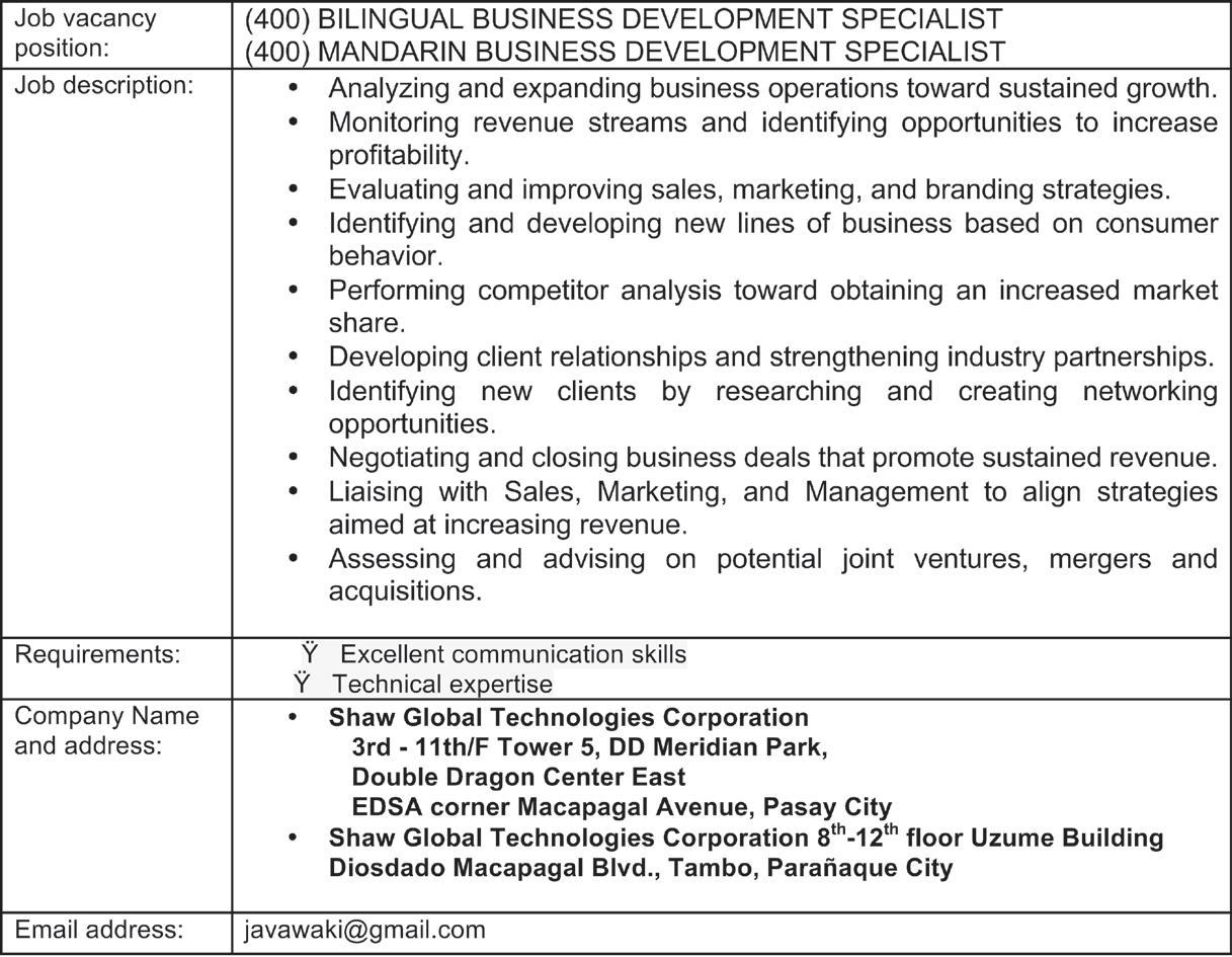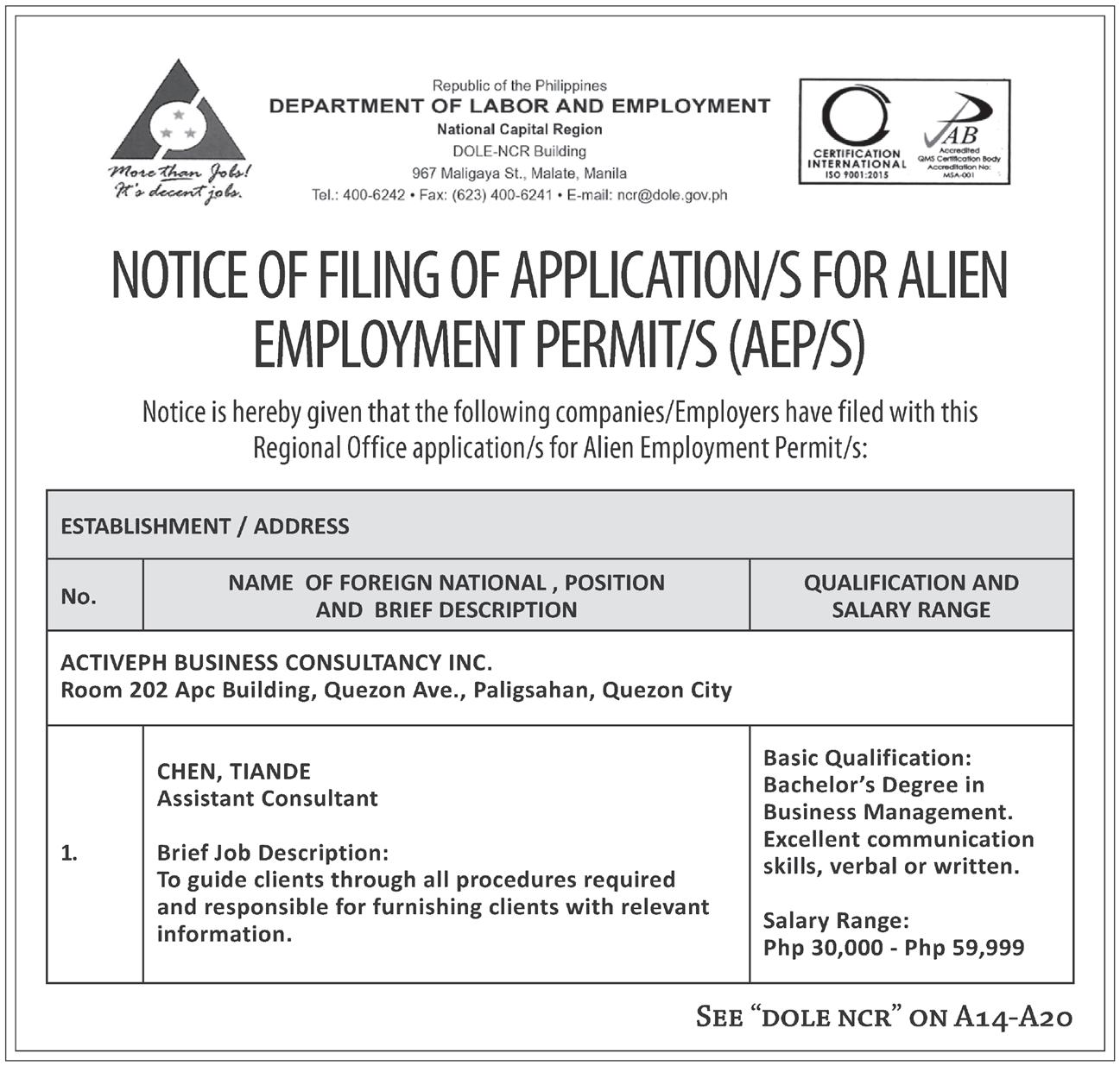 LI, WEI Operation Supervisor Brief Job Description: Analyze business requirements and customer needs. Basic Qualification: At least college graduate. Salary Range: Php 30,000 - Php 59,999 285. SHI, JIAN Operation Supervisor Brief Job Description: Analyze business requirements and customer needs. Basic Qualification: At least college graduate. Salary Range: Php 30,000 - Php 59,999 286. ZHANG, BO Operation Supervisor Brief Job Description: Analyze business requirements and customer needs. Basic Qualification: At least college graduate. Salary Range: Php 30,000 - Php 59,999 SEEKTOP SERVICE MANAGEMENT INC. 25/f Alphaland Corporate Tower, 7232 Ayala Ave. Extn. Cor. Malugay St., Bel-air, City Of Makati 287. NGUYEN THU HANG Customer Relation Representative (Mandarin Translation) Brief Job Description: Handle service support calls, emails and chats related to inquiry from clients and/or customers through Mandarin to English language translation. Basic Qualification: Through and extensive fluency in Mandarin language and characters. Salary Range: Php 30,000 - Php 59,999 SKYLYNX TECH INC. 11/f Alphaland Corporate Tower 3, 7232 Ayala Ave. Extn. Cor. Malugay St., Bel-air, City Of Makati 288. LIEW KAH SHIONG Business Development Chinese Speaking Brief Job Description: Contacting potential clients to establish rapport and arrange meetings. Basic Qualification: 21 yrs. old and above with business development experience. Salary Range: Php 30,000 - Php 59,999 THERMOPOWER CONTROL CORPORATION #383 F., San Diego St., Viente Reales, City Of Valenzuela 289. LI, CHANGXIN Site Project Supervisor Brief Job Description: Provide quality control, ensuring construction work meets the set quality standards and specifications. Basic Qualification: College graduate. With previous work experience in a similar role. Salary Range: Php 30,000 - Php 59,999 290. LI, HUIXIONG Site Project Supervisor Brief Job Description: Provide quality control, ensuring construction work meets the set quality standards and specifications. Basic Qualification: College graduate. With previous work experience in a similar role. Salary Range: Php 30,000 - Php 59,999 VESSE E-COMMERCE INC. 20th Floor Two/neo Building, 3rd Avenue Corner, 28th Street, Bonifacio Global City, Fort Bonifacio, City Of Taguig 291. XU, JUNJIE Mandarin Speaking Finance Director Brief Job Description: Set up and oversee the company’s finance IT system. Basic Qualification: Have excellent verbal and written communication skills and able to organize their work using tools. Salary Range: Php 30,000 - Php 59,999 292. SUN, CHENGWEI Mandarin Speaking Live Stream Manager Brief Job Description: Collaborate with agencies and other vendor partners. Basic Qualification: Have excellent verbal and written communication skills and able to organize their work using tools. Salary Range: Php 30,000 - Php 59,999 VICCI BUSINESS CONSULTANCY CORP. 10/f Liberty Plaza, 102 H.v. Dela Costa St., Bel-air, City Of Makati 293. CHOU, CHIEN-WEI a.k.a. CHOU, CHAN-YU Customer Relation Representative (Mandarin Translation) Brief Job Description: Handles service support calls, emails and chats related to client’s inquiry. Basic Qualification: Fluent in English, Mandarin and any language. Salary Range: Php 30,000 - Php 59,999 VXI GLOBAL HOLDINGS B.V. (PHILIPPINES) Sm Cyberzone 2, Jupiter Cor. Zodiac Streets, Bel-air, City Of Makati 294. LEWIS, LORENZO Vice President For Client Services Brief Job Description: Oversees the entire client services team. Basic Qualification: Strong people management skill. Salary Range: Php 150,000 - Php 499,999 WANFANG TECHNOLOGY MANAGEMENT, INC. 6-9/f Tower 2 Double Dragon Plaza, Edsa Cor. Macapagal Ave., Barangay 76, Pasay City 295. DOAN VAN MUNG Vietnamese Customer Service Representative Brief Job Description: Attracts potential customers by answering product and service questions, and suggesting information about other products and services. Basic Qualification: Proficient in speaking, reading and writing in English and their respective native language for the position applied for. Salary Range: Php 30,000 - Php 59,999 296. NGUYEN THI THU TRANG Vietnamese Customer Service Representative Brief Job Description: Attracts potential customers by answering product and service questions and suggesting information about other products and services. Basic Qualification: Proficient in speaking, reading and writing in English and their respective native language for the position applied for. Salary Range: Php 30,000 - Php 59,999