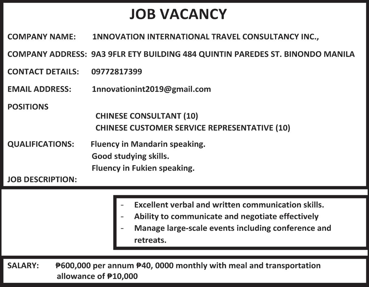 in speaking in Mandarin language. Salary Range: Php 30,000 - Php 59,999