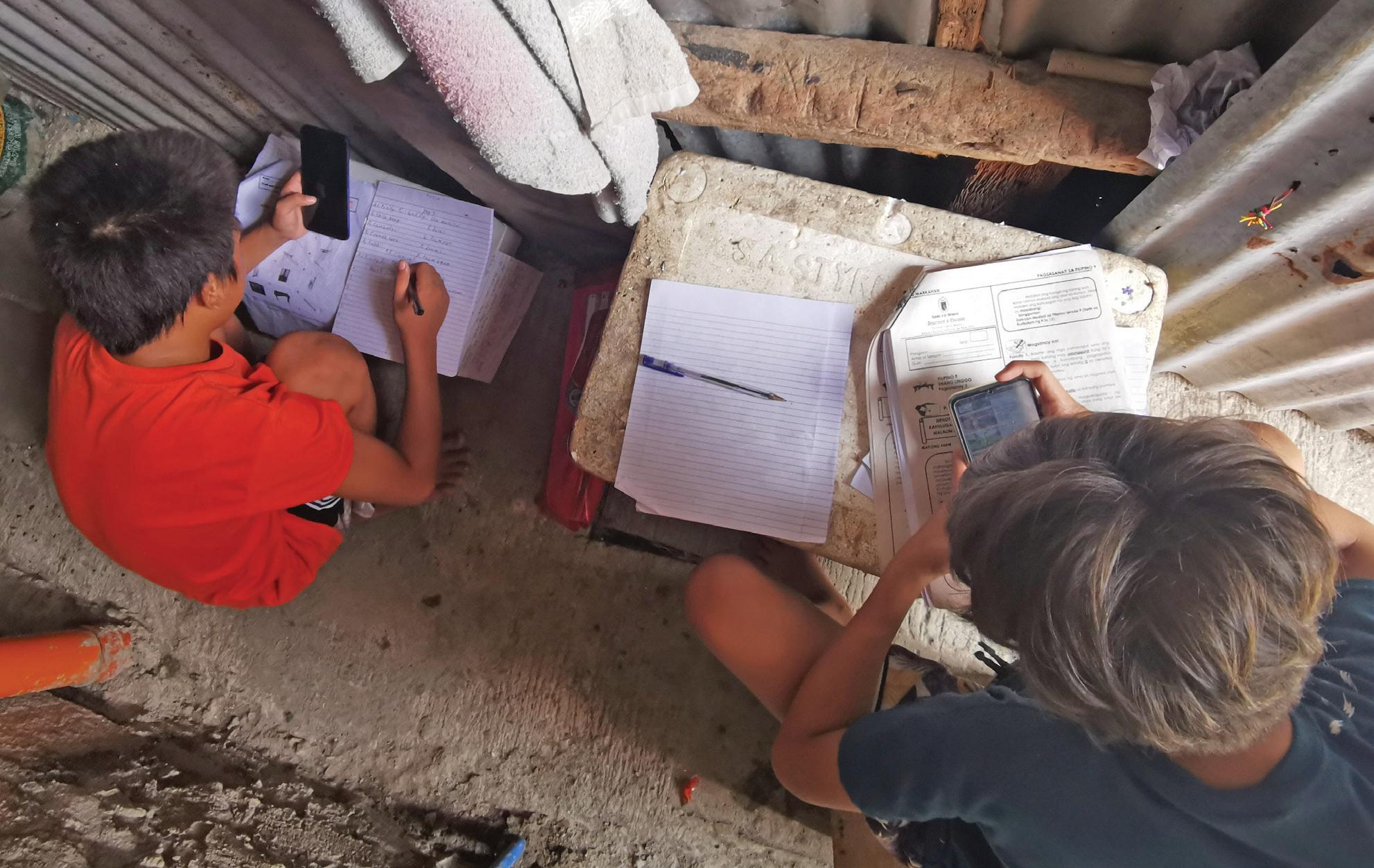 IN this October 6, 2020, file photo, Brix and Jed Callapatia, Grade 9 and 7 students in Las Piñas, gather in a small alley to access a reliable internet signal for their school modules. The struggles with poor internet connectivity highlight the challenges faced in online classes due to the new blended learning system amid the coronavirus pandemic. NONIE REYES
