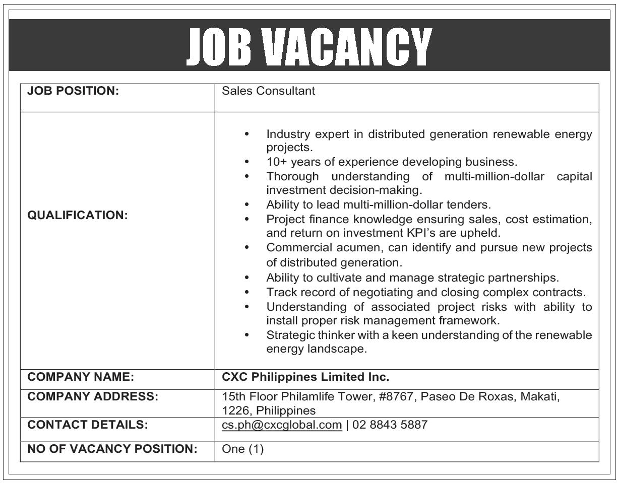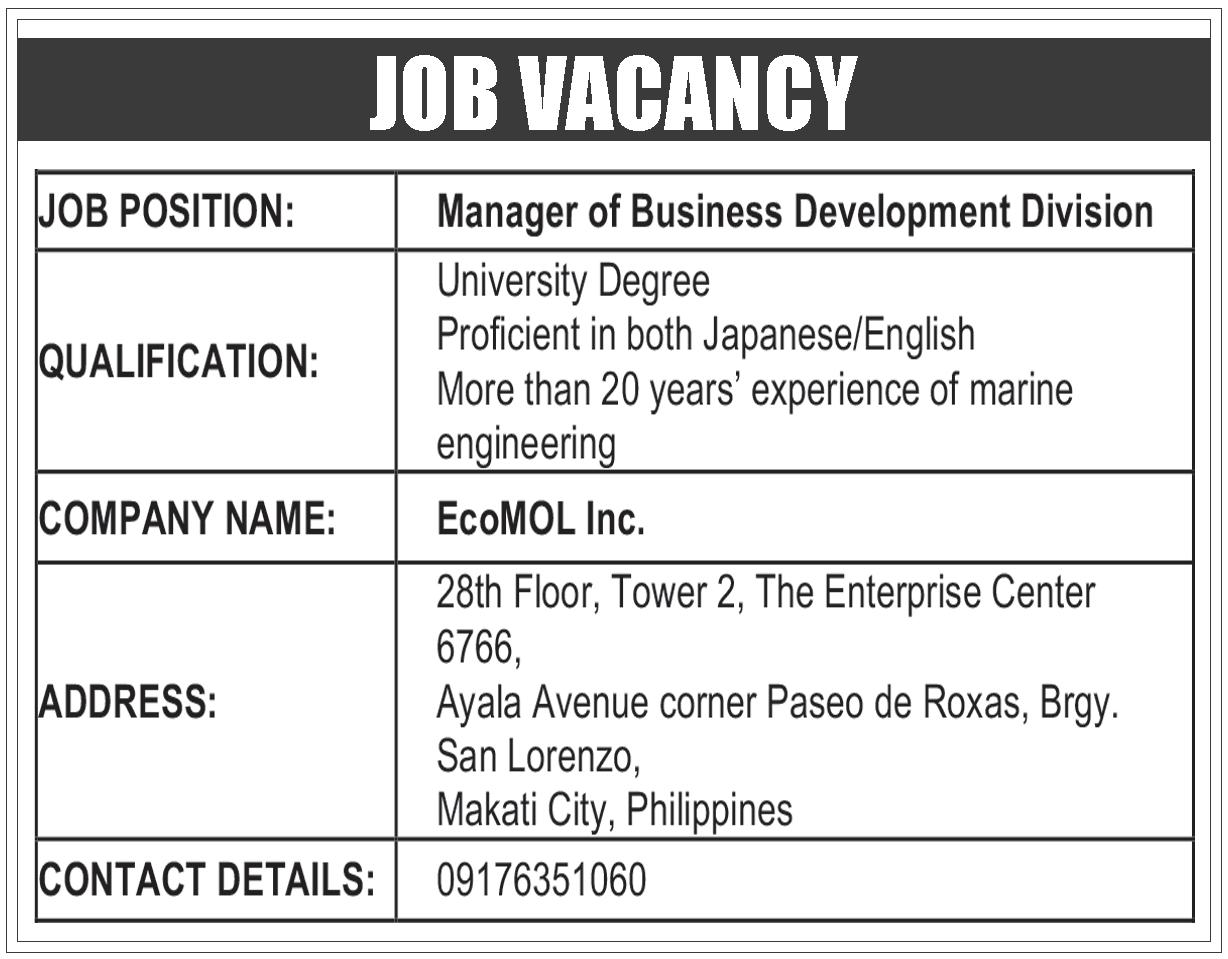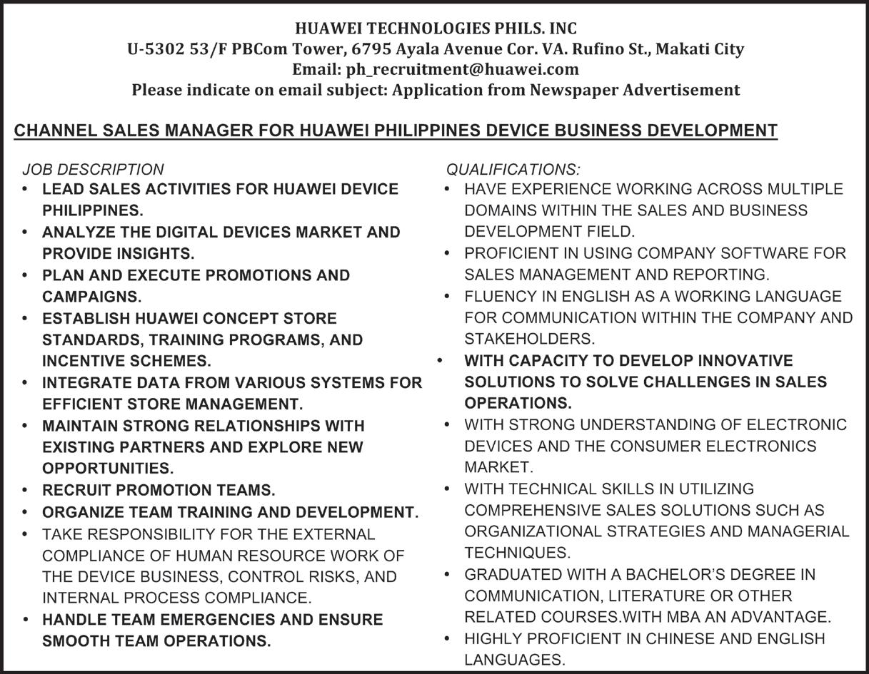 PHAN VIET NGUYEN Vietnamese Customer Service Brief Job Description: Customer support and data base services. Basic Qualification: Knowledgeable in computer applications with good verbal and written communication skills. Salary Range: Php 30,000 - Php 59,999 262. ROAN VAN TIEP Vietnamese Customer Service Brief Job Description: Customer support and data base services. Basic Qualification: Knowledgeable in computer applications with good verbal and written communication skills. Salary Range: Php 30,000 - Php 59,999 NEW PBY CONSTRUCTION CORPORATION 21st Floor Menarco Tower, 32nd Street, Bonifacio Global City, Fort Bonifacio, City Of Taguig 263. LEI, XIANG Purchasing Assistant Brief Job Description: Review and analyze requisitions for equipment and supplies and place orders. Basic Qualification: Fluent in multiple languages, both verbal and written. Salary Range: Php 30,000 - Php 59,999 264. ZHANG, PENGZI Purchasing Assistant Brief Job Description: Review and analyze requisitions for equipment and supplies and place orders. Basic Qualification: Fluent in multiple languages, both verbal and written. Salary Range: Php 30,000 - Php 59,999 P-H-O-E-N-I-X PETROLEUM PHILIPPINES, INC. 15th Floor Udenna Tower Rizal Drive Corner, 4th Avenue, Bonifacio Global City, Fort Bonifacio, City Of Taguig 265. DUONG MINH TIEN Trading Analyst Brief Job Description: Support the supply team to achieve its mandate of ensuring continuous supply of products at the least cost. Tracks down market movement, and recommend pricing basis for each import parcel, timing of trigger pricing and/or need to push volumes. Basic Qualification: College graduate. With at least a year of work experience in trading and planning in the petroleum supply chain and logistics industry. Salary Range: Php 30,000 - Php 59,999 POWERCHINA PHILIPPINES CORPORATION Unit 2101 21/f Bdo Equitable Tower, 8751 Paseo De Roxas, Bel-air, City Of Makati 266. NGUYEN, DAI TAI Mandarin Project Planner Brief Job Description: The Mandarin Project Planner is responsible for planning and scheduling various workloads. Gathers and analyzes information to prepare status report. Evaluate current procedures and recommends changes to improve the efficiency of planning and scheduling of projects. Basic Qualification: In-depth understanding of construction procedures, materials and project management principles. Must have understanding in cost planning and contracts administration. Familiarity with construction/project management in Mainland China and the Philippines. Salary Range: Php 30,000 - Php 59,999 267. QIN, XIAOFEI Purchasing Assistant Brief Job Description: Review and analyze requisitions for equipment and supplies and place orders. Basic Qualification: Fluent in multiple languages, both verbal and written. Salary Range: Php 30,000 - Php 59,999 PRIME ENERGY RESOURCES DEVELOPMENT B.V. 17th-18th 19th & 20th Floor Asian Star Bldg, Asean Drive Filinvest, Alabang, City Of Muntinlupa 268. GANT, ERIC JAMES SNR Completions Manager Brief Job Description: Design and plan well completions for optimal production. Design well completion equipment based on reservoir data. Oversee equipment installation, testing and optimization. Basic Qualification: College graduate. With at least 8 years of work experience in drilling operations, with focus on advanced drilling engineering. Salary Range: Php 500,000 and above PROCTER & GAMBLE PHILIPPINES, INC. 10f Seven/neo, 5th Ave., Crescent Park West, Bonifacio Global City, Fort Bonifacio, City Of Taguig 269. JAIN, UTKARSH Corporate Market Strategy & Planning Director Brief Job Description: Manage trading funds at a corporate level for all sales activities. Ensure all sales processes and company resources are well-designed and followed. Basic Qualification: College graduate. With previous work experience in a similar role. Salary Range: Php 150,000 - Php 499,999 QUANHAO TECHNOLOGY CORPORATION Unit E104 Easyway, Metlive Mall, Macapagal Cor. Ext, Barangay 76, Pasay City 270. HU, JIANLEI Mandarin Speaking-IT Specialist Brief Job Description: Installing new software and hardware components. Regularly evaluating IT systems. Basic Qualification: Excellent in written and verbal communication in Mandarin language. With at least 1 year experience in IT. Salary Range: Php 30,000 - Php 59,999 271. ZHANG, HONGXIANG Mandarin Speaking- IT Specialist Brief Job Description: Installing new software and hardware components. Regularly evaluating IT systems. Basic Qualification: Excellent in written and verbal communication in Mandarin language. With at least 1 year experience in IT. Salary Range: Php 30,000 - Php 59,999 RRA ONE GLOBAL CONSULTANCY CORP. Blk 1 Lot 6 Progressive St., Lucky Homes Subd., Barangay 168, City Of Caloocan 272. LI, CHANGJIA Business Development Analyst Brief Job Description: Reporting findings and obtaining approval from senior management when required. Basic Qualification: At least college graduate, can speak, write and type in Mandarin and Vietnamese languages. Salary Range: Php 30,000 - Php 59,999 273. GU, JIAYU Chinese Speaking Business Development Associate Brief Job Description: Familiarizing yourself with all products and services offered by our company. Basic Qualification: At least college graduate. Salary Range: Php 30,000 - Php 59,999 274. JIANG, ZHAOXUN Chinese Speaking Business Development Associate Brief Job Description: Familiarizing yourself with all products and services offered by our company. Basic Qualification: At least college graduate. Salary Range: Php 30,000 - Php 59,999 275. MING, YUSHENG Chinese Speaking Business Development Associate Brief Job Description: Familiarizing yourself with all products and services offered by our company. Basic Qualification: At least college graduate. Salary Range: Php 30,000 - Php 59,999 276. ZHENG, LIANCHENG Finance Manager Brief Job Description: Perform financial duties including generating financial data. Basic Qualification: Can speak, write and type in Mandarin and Vietname
