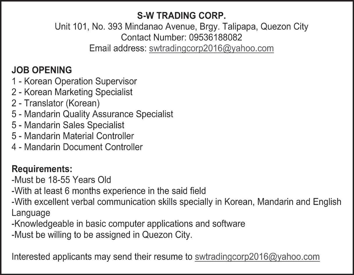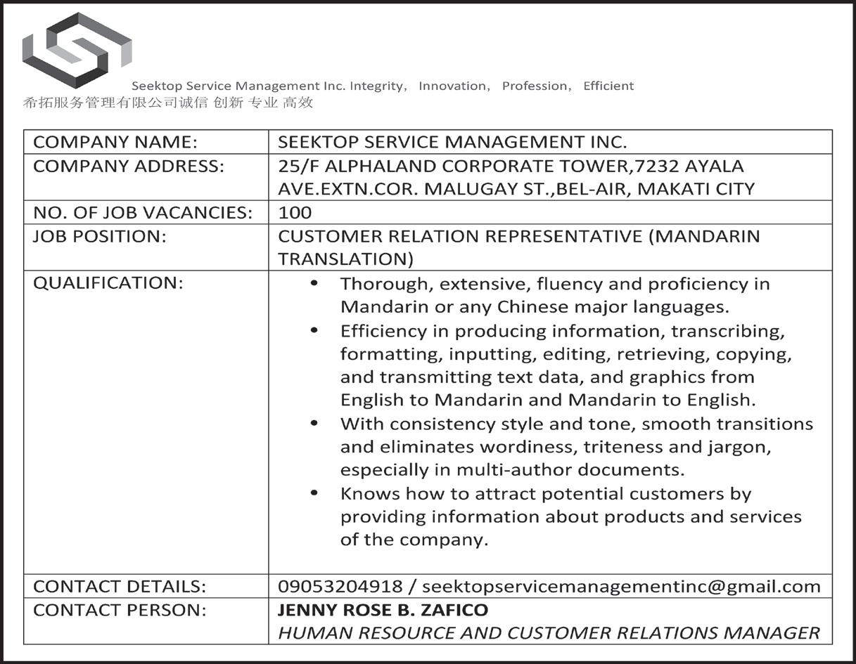 Basic Qualification: Proficient in speaking in Mandarin language. Salary Range: Php 30,000 - Php 59,999