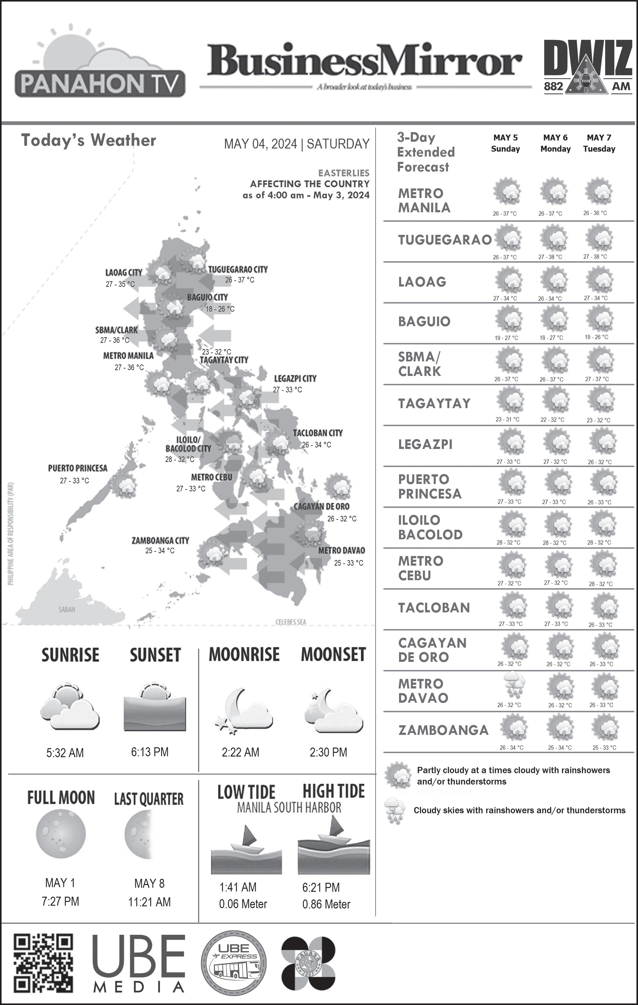 PESO EXCHANGE RATES n US 57.5840 n JAPAN 0.3746 n UK 72.1931 n HK 7.3694 n CHINA 7.9701 n SINGAPORE 42.5194 n AUSTRALIA 37.7981 n EU 61.7646 n KOREA 0.0422 n SAUDI ARABIA 15.3537 Source: BSP (May 3, 2024) A broader look at today’s business BusinessMirror EJAP JOURNALISM AWARDS BUSINESS NEWS SOURCE OF THE YEAR (2017, 2018, 2019, 2020) DEPARTMENT OF SCIENCE AND TECHNOLOGY 2018 BANTOG MEDIA AWARDS 2006 National Newspaper of the Year 2011 National Newspaper of the Year 2013 Business Newspaper of the Year 2017 Business Newspaper of the Year 2019 Business Newspaper of the Year 2021 Pro Patria Award PHILIPPINE STATISTICS AUTHORITY 2018 Data Champion www.businessmirror.com.ph n Saturday, May 4, 2024 Vol. 19 No. 200 P25.00 nationwide | 20 pages | 7 DAYS A WEEK Continued on A2 THE LONELY, LONELY YEARS PHL PROGRESS, BUT NOT AT THIS PRICE