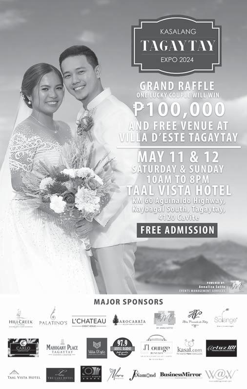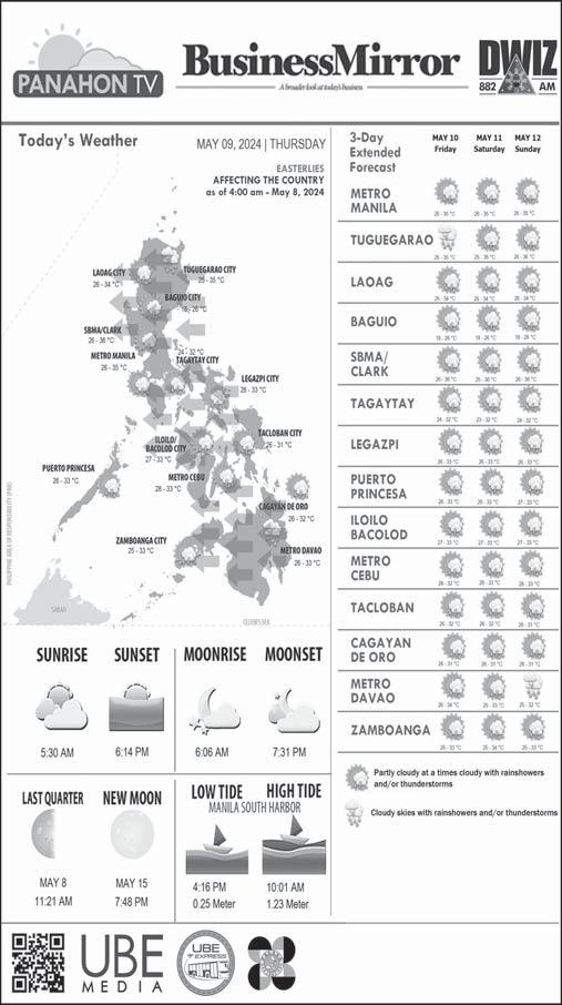 refined www.businessmirror.com.ph Thursday, May 9, 2024 Vol. 19 No. 205 P. nationwide | sections pages | 7 DAYS A WEEK DRY SPELL CAUSES AGRI, FISHERIES 1-M JOB LOSS PESO EXCHANGE RATES US 57.2460 JAPAN 0.3703 UK 71.6205 HK 7.3197 SINGAPORE 42.2729 AUSTRALIA 37.7595 SAUDI ARABIA 15.2640 EU 61.5852 KOREA 0.0422 CHINA 7.9309 Source BSP (May 8, 2024) BusinessMirror A broader look at today’s business ROTARY CLUB OF MANILA JOURNALISM AWARDS 2006 National Newspaper of the Year 2011 National Newspaper of the Year 2013 Business Newspaper of the Year 2017 Business Newspaper of the Year 2019 Business Newspaper of the Year 2021 Pro Patria Award PHILIPPINE STATISTICS AUTHORITY 2018 Data Champion EJAP JOURNALISM AWARDS BUSINESS NEWS SOURCE OF THE YEAR (2017, 2018, 2019, 2020) DEPARTMENT OF SCIENCE AND TECHNOLOGY 2018 BANTOG MEDIA AWARDS FACTORY OUTPUT POSTS 3% AVERAGE GROWTH IN Q1–PSA See “Agri,” A POWERING UP PROGRESS Vivian S. Santos, Deputy Director General of Operations at the Philippine Economic Zone Authority (Peza); Rosario, Cavite Vice Mayor Joanne Michelle “Bamm” Gonzales; Ireen Catane, Country President of Schneider Electric Philippines; and Rizalino Jose C. Torralba, District Collector of the Port of Manila, Bureau of Customs, grace the grand opening of Schneider Electric’s Smart Distribution Center in Cavite Export Zone. The energy management and automation company officially inaugurated its updated Cavite Smart Distribution Center, marking a significant investment of P86.5 million. Schneider Electric has enhanced the facility with cutting-edge Fourth Industrial Revolution technologies to support regional growth and global advancements driven by the energy transition and digitalization. NONIE REYES GIR still above $100-B level, but dips in April HAS ISRAEL FOLLOWED THE LAW IN ITS WAR IN GAZA? THE US IS DUE TO RENDER FIRST-OF-ITS-KIND VERDICT THE WORLD »A10 Continued on A See “El Niño,” A Q1 farm output inches up 0.05% despite El Niño