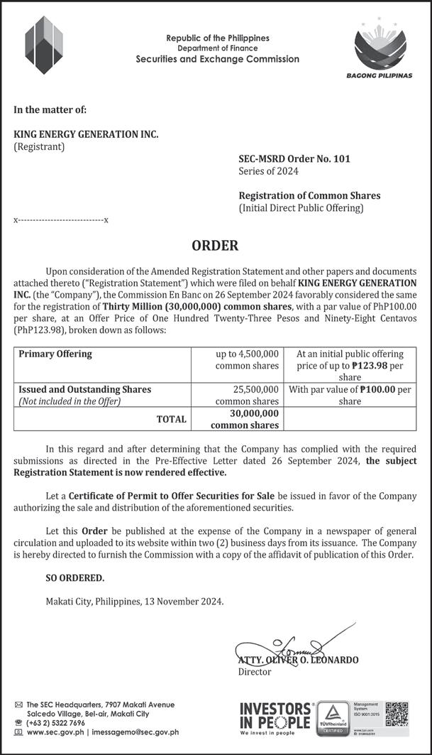 THE National Grid Corporation of the Philippines (NGCP) has fully energized its 230-kiloVolt (kV) Cebu-Bohol Interconnection project with a capacity of 1,200 megawatts (MW). The Cebu-Bohol transmission line is a new transmission facility that connects Argao, Cebu, and Maribojoc, Bohol via 54.6 circuit-kilometers of submarine cables crossing the Bohol Strait, and 97.6 circuit-