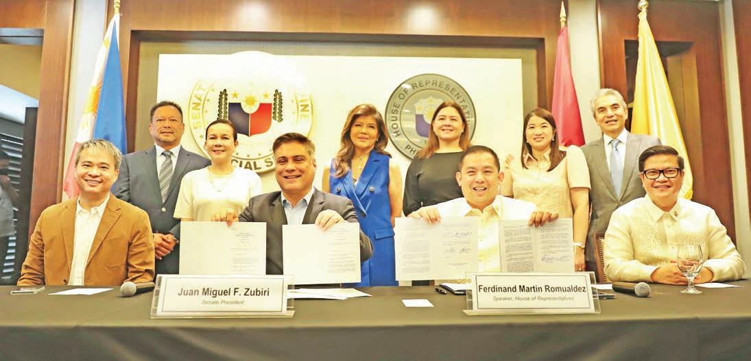 FIRST 2 BILLS Senate President Juan Miguel “Migz” F. Zubiri and House Speaker Ferdinand Martin G. Romualdez show the enrolled bills on the SIM registration and on the postponement to 2023 of this year’s barangay and Sangguniang Kabataan (SK) elections after signing these on Tuesday. The two bills, earlier ratified by the Senate and the House of Representatives, are the first measures to be submitted by the 19th Congress to Malacañang for President Marcos Jr.’s approval. After the signing, the two enrolled bills were received by PLLO Sec. Mendoza for transmittal to the Office of the President. Story on A16, Second Front Page. SENATE PRIB PHOTO