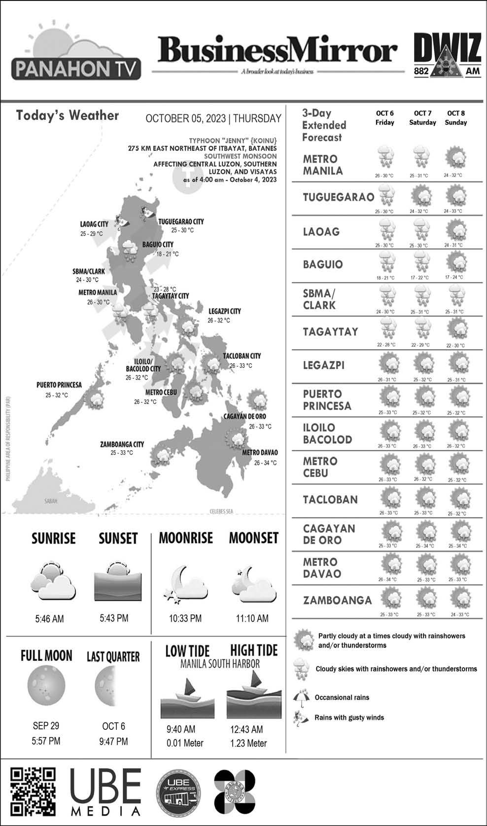 P. | | 7 DAYS A WEEK PESO EXCHANGE RATES US 56.8800 ■ JAPAN 0.3816 ■ UK 68.6940 ■ HK 7.2625 ■ SINGAPORE 41.4185 ■ AUSTRALIA 35.8401 ■ SAUDI ARABIA 15.1660 ■ EU 59.5363 ■ KOREA 0.0418 ■ CHINA 7.7779 Source: BSP (October 4, 2023) BusinessMirror A broader look at today’s business ■ Thursday, October 5, 2023 Vol. 18 No. 353 ROTARY CLUB OF MANILA JOURNALISM AWARDS 2006 National Newspaper of the Year 2011 National Newspaper of the Year 2013 Business Newspaper of the Year 2017 Business Newspaper of the Year 2019 Business Newspaper of the Year 2021 Pro Patria Award PHILIPPINE STATISTICS AUTHORITY 2018 Data Champion EJAP JOURNALISM AWARDS BUSINESS NEWS SOURCE OF THE YEAR (2017, 2018, 2019, 2020) DEPARTMENT OF SCIENCE AND TECHNOLOGY 2018 BANTOG MEDIA AWARDS