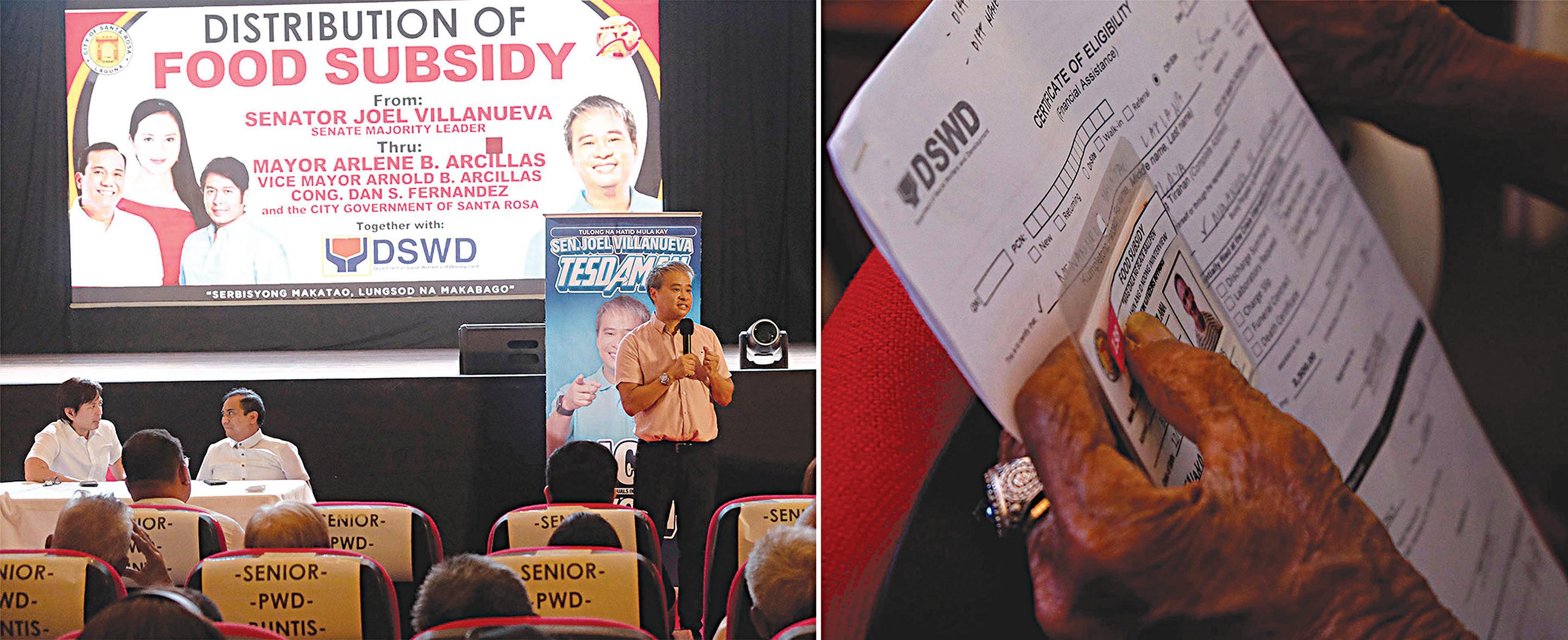 PAYOUT Senate Majority Leader Senator Joel Villanueva spearheaded the payout activities of the Department of Social Welfare and Development (DSWD) Assistance to Individuals in Crisis Situation (AICS) in Santa Rosa City, Laguna, and the DSWD AICS Payout along with the Department of Labor and Employment (DOLE) Tulong Panghanapbuhay sa Ating Disadvantaged/Displaced Workers (TUPAD) payout in Biñan City, Laguna. The initiatives benefited a total of 800 individuals in Santa Rosa City and 1,000 beneficiaries in Biñan City. The event was attended by Santa Rosa Mayor Arlene Arcillas and Laguna 4th District Rep. Dan Fernandez. ROY DOMINGO